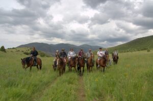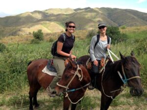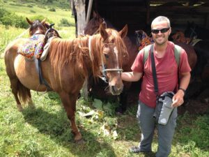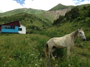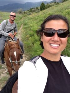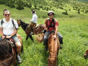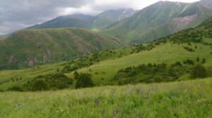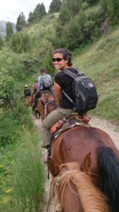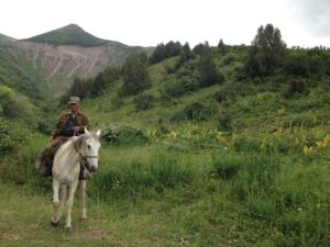 21 Jun – Almost everyone signed up for either horseback riding or hiking today. Our lunch boxes (provided) were massive so we had to search around for a backpack large enough to carry our picnic. Even though we had been advised that the park rangers would be ready to go at 10 am, it was closer to 11 am when they finally showed up with horses in tow. Robby scored a horse named “ice cream” who loved to run like crazy so he was pretty happy with his ride. Meanwhile, Becky got a gelding that she nicknamed “muncher” or “devil horse”, depending how his mood. He definitely didn’t like being behind other horses, so if they took off running, you could be sure that he would too! The scenery in Aksu-Zhabagly is stunning and mountainous…we sure were happy to be riding instead of hiking. Lunch was at the midway point at a ranger’s small cabin. Brian didn’t bring a lunch and was refusing to eat anything even though several people offered him some food. We had been worried about rain in the forecast but only got a slight drizzle, which made for a fantastic afternoon out in the national park. After lunch, we continued further up the trail and the horses decided to race each other. It was a bit scary for Becky as her stirrups were way too short, which led to severely cramped legs and the inability to control her horse. Once her gelding went from a gallop back down to a canter, she was able to breathe easy again. Our turnaround point was at the 14 km mark, another ranger’s cabin. The ranger pointed out several bears on the mountaintop but without binoculars, they were impossible to make out. Snow leopards remain once of the most elusive creatures at Aksu-Zhabagly, and unsurprisingly, we didn’t spot any. At the turnaround point, Andy and Kyle decided to opt out of riding back. Kyle’s long legs were way too cramped and Andy wasn’t feeling comfortable with his horse. It didn’t take long for Chris and Anthony to step up and swap places. The return ride felt quite long as we were starting to cramp up all over. Poor Brian seemed to have had a crisis on the mountain because he became too weak to walk down on his own so Chris offered up his horse to Brian. We were focused on getting back to our campsite after more than 5 hours on horseback and when we finally dismounted, had to strain not to walk bowlegged! Cook group of Connie, Chris and Conrad made a mean pot of garlic mac and cheese…freaking yum! Delicious meal and we all got to enjoy it together in the communal kitchen area since it was raining cats and dogs outside. The rain was relentless for the majority of the night but we made a break for our tent once it let up a bit.
