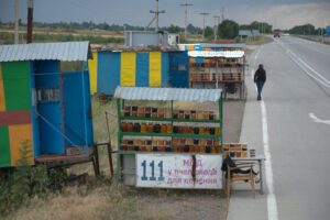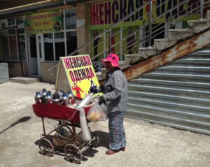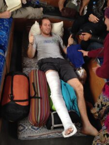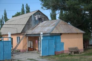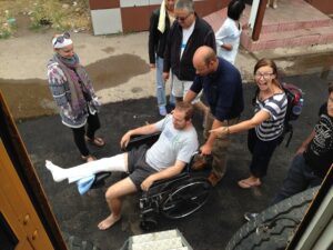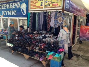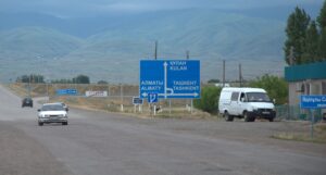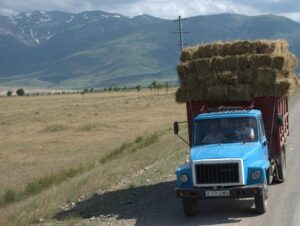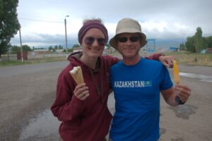 23 Jun – Kyle returned with the truck at 7 am and we woke to find a curious Kazakh cowboy camped on a nearby hill staring intently at our campsite. He probably was wondering how the hell we got here and where our horses were! Kyle told us to go ahead and have breakfast and we would swing by the hospital afterwards to pick up Kate and Ben. Ben had apparently broken his leg in two places, and he was going to try to do the border crossing with a leg cast and all. Helen and Ant ran around looking for crutches for Ben (and managed to find some), while Ben painfully eased himself onto the truck. It was a painful maneuver as he had limited mobility and was still in an enormous amount of pain. Thankfully it was a short drive to the border where we crossed near Merke in Kazakhstan and into Chaldovar on the Kyrgyzstan side. Amazingly, Kate managed to convince the border guards to come onto the truck to stamp Ben out of Kazakhstan and they agreed. A grateful Ben exited out of Kazakhstan and entered Kyrgyzstan while on his back the whole time which surely must be a first!