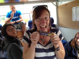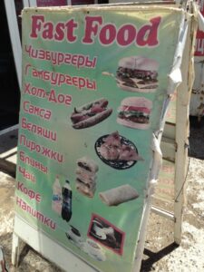 19 Jun – After exiting Uzbekistan, we thought it would be a simple and straightforward entry into Kazakhstan via the Kirovo border. Little did we know that this would be the most memorable border crossing of the trip! Kate had made goodie bags for us to enjoy as we anticipated the crossing taking several hours during lunch time. It was a stifling hot day and for those of us lucky enough to get through, the surly border staff kept pushing us out of the shaded areas into the sun. Every time we would think that we found a suitable place to camp out, they would come running along and push us forward to yet another waiting area. It was ridiculous…tempers were raised as we didn’t understand why they couldn’t just let us be. Finally, after being told that we couldn’t hang out anywhere in the border area, we finally exited no-man’s land and found a nearby cafe in Kirovo to wait out the next few hours. We knew it would take a while since Kyle was at the back of the truck queue and none of the trucks were getting through. Perhaps the border staff was on an extended lunch break? After sussing out the exchange rate situation (half the official rate for Som and only marginally better for dollars….no thanks), we played a game called salad, which is a lot like charades (the group is split into 2 teams – boys vs girls. You write down topics on a piece of paper, fold it up and toss it into a bowl. There are 3 rounds per game with everyone’s teammates guessing what the topics are. First round you are allowed to speak and describe, round two is charades where you can act out the topic but can’t utter a word and final round is where you can only say one word. Each round takes a minute and all teammates shuffle through until all words are guessed). It was during play time that we saw an angry Kevin getting marched across no man’s land to deal with one of the rip off exchange guys. He looked pissed and wouldn’t tell us anything so we assumed the worst. Then the rumor came that both Kevin and Daniel were being denied entry since Kazakhstan will not give either Canada or Ireland a visa upon entry. Since they only had a single entry Uzbekistan visa and had already exited Uzbekistan, they were essentially stuck in no-man’s land since Kazakhstan refused to let them enter and Uzbekistan was standing their ground that they had no valid visa. Poor Kate was trying her best to assist in this dreadfully stressful situation. Meanwhile, it took Kyle roughly 6 hours to get the truck through…even when he finally crossed the border (yippee), we still had to wait to see what would happen to Kevin and Daniel since there was still no resolution. Since none of us had lunch, Kyle decided to pull away from the border and have cook group (Becky, Gill and Ben) prepare dinner (tuna pasta with a hidden clove of garlic surprise). Young Kate got a unibrow painted on (apparently considered very sexy in Kazakhstan), and everyone else was searching for cold beer. Finally, Kate emerged from no-man’s land to tell us that Kevin and Daniel were on their way to Tashkent and would meet us later in Bishkek. Rather than camp right by the border, we decided to pack up after dinner and drive onward for an hour to a bush camp. Spectacular moon rise and a field full of crickets…welcome to Kazakhstan!