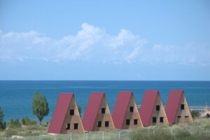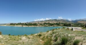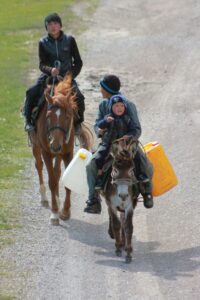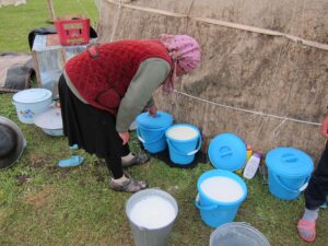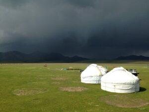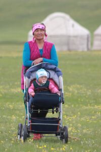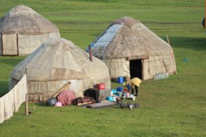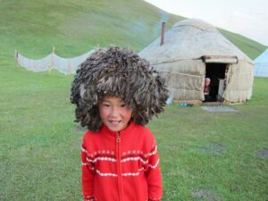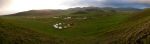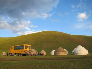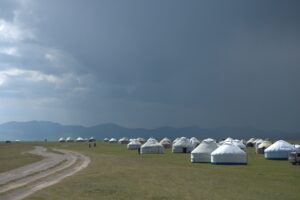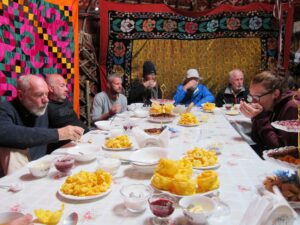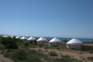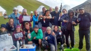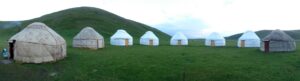 01 Jul – Up early and on the road by 7:30 am. We drove along the southern shore of the Orto-Tokoy Resevoir and stopped in Kochkor so that Becky’s cook group (Becky, SCUBA Gill and Kevin) could do some shopping. Kate had also coordinate to pick up Abas, the yurt camp director, for the upcoming couple of nights at Son-Kul Lake so we had to wait for him to show up. Ben had thoughtfully given Kate $50 for the group to use to buy some goodies (for helping him out with his broken leg ordeal). Thanks Ben! We loaded up on all sorts of booze, mixers and snacks…$50 went a long way in Kyrgyzstan. From Kochkor we had a long drive towards Son-Kul Lake. The scenery was phenomenal and everyone was hopping from one side of the truck to the other to capture the sights. At the top of a mountain pass, Kate and Kyle spotted a snow bank and stopped to fill the coolers so that our drinks could remain ice-cold. Then our long, bumpy ride continued. About 8 km outside of the yurt camp, we had to buzz to stop the truck so we could put the flaps down. There was simply way too much dust that was coming in from both sides of the truck and we were choking on it. And finally, our home for the next 2 nights came into sight…our Son-Kul Lake homestay, yurt style. Of course we immediately volunteered to pair up with Ichi and Lars for the party yurt. And it didn’t take long to bust out Ben’s liquor and snacks! Son-Kul Lake….we love you already. A fantastic afternoon of drinking ensued. Since we were at altitude, it took forever for Dya, Denise and Kate to prepare dinner (or so they claimed…we think Ben’s beverages may have played a role!). After dinner, the party moved to our yurt until the campsite shut off electricity at 11 pm. Fun day today!