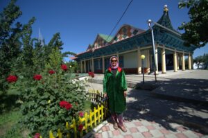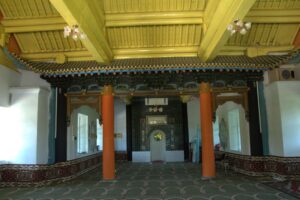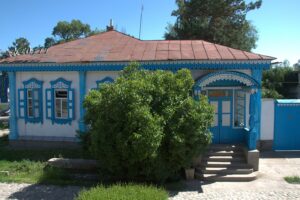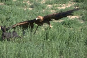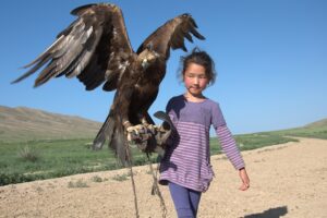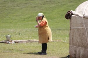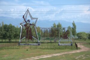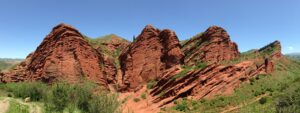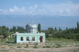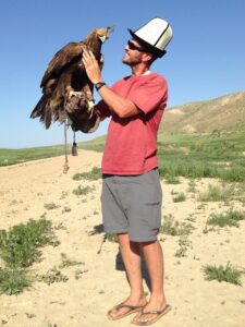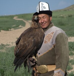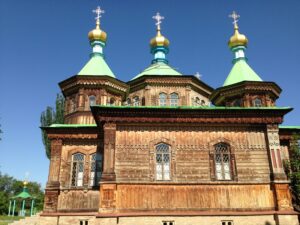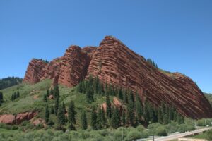 30 Jun – The Karakol homestay family prepared an early morning breakfast for us and we were packed and ready to go by 8:30 am. Our first stop was in Karakol itself where cook group went shopping and the rest of us were told to buy our own lunch. Andy had scored some delicious paratha at the Karakol bazaar on our first trip here, and we were keen on having that for lunch so we followed him to his source. Unfortunately, the paratha was sold out so we had to settle for some flat onion bread instead which ended up being OK but not as yummy as the paratha. Since we still had some time to kill, we decided to squeeze in a bit of sightseeing around Karakol, stopping at both the Holy Trinity Cathedral (fantastic woodwork, worth a visit) and the Dungan Mosque. Back on Habibi, SCUBA Gill discovered she had inadvertently left her shoes at the homestay so Kyle had to backtrack for them. Then we were off, with the destination of the Tien Shan mountain range (Issyk-Kul). Unfortunately, Kate got a text message advising her that the notoriously difficult Torugart Pass into China would be closed on our currently scheduled crossing day. Armed with this new information, she had Kyle pull over where she could get phone reception and then proceeded to come up with two courses of action. Option A was to continue to the Tien Shan mountains but skip out on eagle hunting and goat polo at Son-Kul Lake and Option B was to skip the famous wooden bridge crossings at Issyk-Kul and head directly for Son-Kul Lake instead. We were gutted…this portion of Kyrgyzstan was supposed to be spectacular. But Kate was adamant that we not mess around with the Torugart border crossing as it is one of the toughest in the world. So after taking a quick truck vote, we decided to cross the border into China 2 days early (thus skipping Issyk-Kul’s Tien Shan mountains). Since we were already pretty close to the red cliffs of Jeti Orguz (seven bulls rocks), the plan was to have a quick lunch there before backtracking and heading south towards a bush camp. The cliffs were pretty spectacular and made for a nice lunch stop. We were able to squeeze in a quick hike (got to see a Kyrgyz family shearing their sheep) before joining the lunch munchers by the truck and polishing off the remainder of Denise’s roasted chicken. Kate called ahead to organize an eagle hunting show for us later that afternoon so we drove directly from Jeti Orguz to Bokonbaevo where we linked up with the eagle hunter. Then it was a short drive to a field where we got to see the eagle hunt in action. We were given the option of watching the eagle hunt a rabbit or sparing the rabbit’s life. Needless to say, the group voted to see a live hunt much to the disgust of nearby Europeans who angrily voiced their opinion and told us that Europeans would never wantonly vote to end life so needlessly. Umm, actually our truck was predominantly European so there goes that theory! The poor bunny rabbit actually had no chance. It was set free upon the field and didn’t have the wits to run away and hide. It just started munching on some shrubbery and the eagle made a quick meal out of it. We were able to take photos with the eagle and marveled at the close relationship the eagle hunter has with his bird…overall a cool experience! Afterwards, we set up our bush camp in the area. Several locals were using a nearby makeshift track to race their horses and the leader yelled at a couple of people to move their tents (they had been erected way too close to the track). After dinner, the skies opened up for a couple minutes and rain poured down but luckily the rain only lasted a few minutes. Kate fed us some chocolate treats and we snuck off to our tent to watch the remainder of 13 Hours before calling it a day.