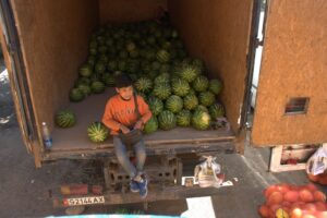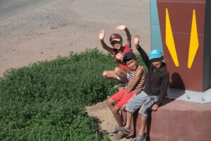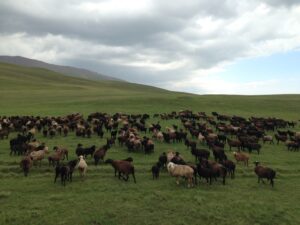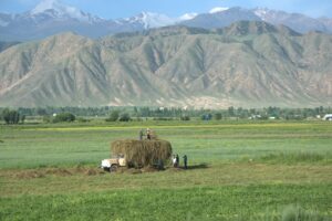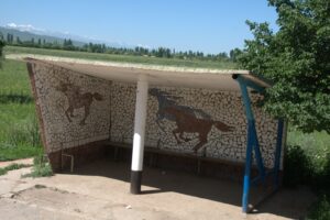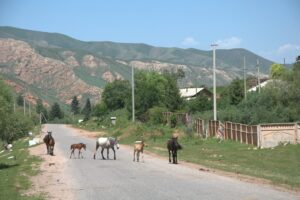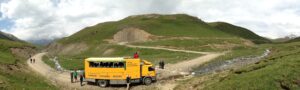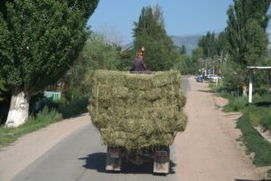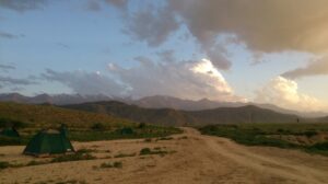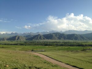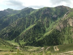 03 Jul – Our yurt camp provided an early breakfast for us and we were on the road by 7 am. Unfortunately, Habibi got stuck on a muddy uphill section of the track which required everyone off the truck. Out came the sand mats and we worked together to get the truck up the hill. After two sticky spots, success! Kyle felt confident that we could stow away the sand mats and reboard Habibi to enjoy the rest of our ride around Lake Son-Kul. It was another wonderful drive day with gorgeous alpine scenery. Leaving the lake area, we drove to Naryn so that cook group could do some shopping. Abas had hitched a ride with us until Naryn where we said our goodbyes. Robby promised to send him some of the photos we had taken of him with his family at Lake Son-Kul. While cook group did their shopping, we were keen on spending the last of our Som, so we partnered with Ichi and found massive bags of colorful toffee sweeties (Kate P had gotten us hooked on the sweeties a couple of weeks ago and we had been on the lookout ever since). Kyle went to gas up the truck so we patiently waited for him to return with Habibi by a central park in Naryn. Unfortunately, our group was a magnet for the drunken homeless who decided to descend on us. It was quite uncomfortable and we were thrilled to see Kyle pull up to rescue us from the situation. From Naryn, we drove as far as we could towards the border crossing, bush camping in a riverbed gravel pit past Ak-Beit. Since we had been driving all day and reached the bush camp pretty late that night, cook group made a simple meal of spaghetti with truck meatballs. It was cold out so everyone retired to their tents immediately after dinner.