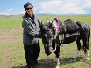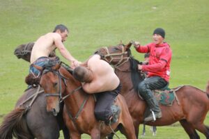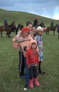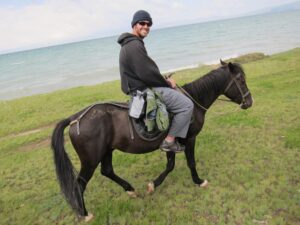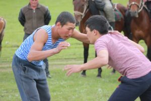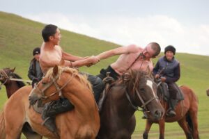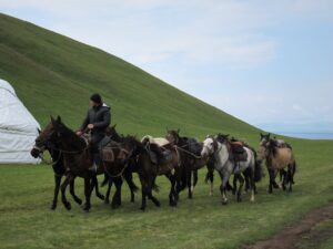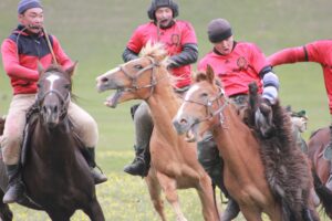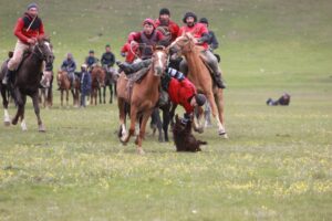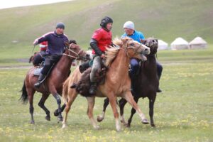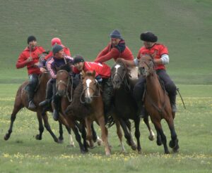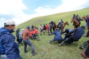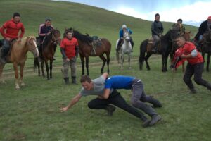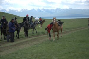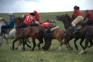 02 Jul – The yurt camp provided breakfast at 8 am. We had signed up for horse riding at 9 am. Becky immediately scouted out the gentlest pony and scored him for herself…he was a beauty. Poor Helen had selected the craziest horse of the bunch and was unable to control it so Robby agreed to swap with her so that she wouldn’t fall off and get hurt. He later agreed that the horse was completely mental – it wouldn’t obey any commands and definitely had a mind of its own. The ride was fun although a bit too short. We wanted to explore more of Son-Kul Lake area but only had about 3 hours total. Nevertheless, it was a spectacular morning and we thoroughly enjoyed riding our horses. After lunch, we had a short siesta until 2 pm. The locals had agreed to put on a game of horse polo (buzkashi or “ulak tartysh” in Kyrgyzstan), where a headless body of a sheep is used to play polo. But first, a couple of other challenges were tossed out. Challenge #1 was a simple game of tug of war, challenge #2 involved staying on your horse while reaching down to scoop up a bag of money at a full gallop (harder than it sounds), and challenge #3 was wresting for dominance while on horseback. The competitors did not take the challenges lightly and we got to see some furious action before the main game of sheep polo commenced. We had missed an opportunity to see buzkashi in Afghanistan so it was great that we got to see ulak tartysh in Kyrgyzstan! The bigger and brawnier red team dominated all the games and proudly held the sheep’s carcass overhead for a team photo afterwards. We wondered if they got to enjoy the spoils of sheep polo for dinner? The meat is sure to be tenderized! Back at the yurt camp, Becky’s group prepared dinner while everyone else had a low key night of drinking. We stayed up late in our yurt watching Dead Pool with Ichi and Lars. Another phenomenal day in Kyrgyzstan!