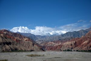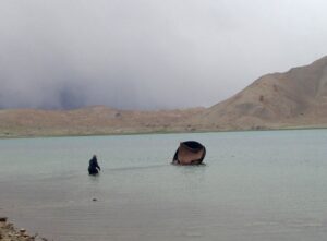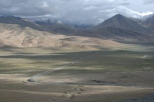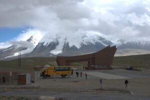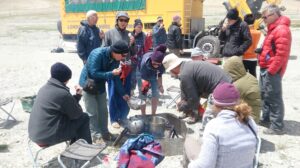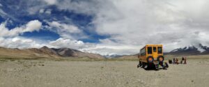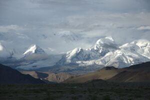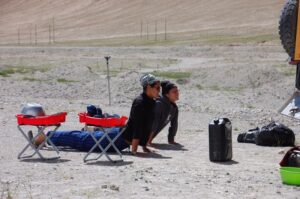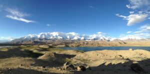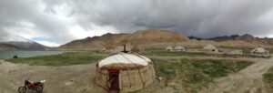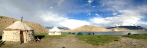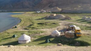 06 Jul – After yesterday’s breakfast fiasco, Kate suggested we have a truck breakfast and provided bread and peanut better. We were packed and ready to leave Kashgar for a quick excursion on the Karakoram Highway and were on the road by 10 am. Our destination for the day? Lake Karakul. The drive was quite picturesque but as we got into the mountainous region, the paved road deteriorated into a rocky trail, coating the back of the truck with a thick level of dust. We sucked up the dusty conditions because the views were quite scenic and it would have quickly become unbearably hot if we threw the tarps down the side of the truck. At a military checkpoint, everyone had to disembark with their passports so we could be screened. Lunch was a quick pit stop at about 1 pm, and we continued on our drive until we got to a “traffic jam”. All vehicular traffic had ground to a halt in the middle of a mountain and we weren’t sure how long the delay would be. Kyle checked it out and discovered that the hold up was because the road narrowed to a single lane and it took a while for trucks to get through. Luckily, we were through the logjam in about 30 minutes. The scenery here was quite stunning as we drove past a lake held captive by mountains. By 6 pm, we finally pulled into our “campsite” for the night, right on the edge of Lake Karakol. The campsite consisted on a few yurts and some old concrete yurt frames that were falling apart. Toilet facilities were a short stroll away behind a small rock barrier but they left a lot to be desired so we decided to take care of business elsewhere. The temperature had dropped dramatically since we arrived to Karakol, so Kate decided to rent a yurt that could be used as a kitchen area so that cook group could get out of the cold. We set up our tent and staked it down since the wind was picking up. Poor Daniel had an experience he will never forget! Becky saw that he was struggling to set up his tent by himself and offered a helping hand. Since he was right on the edge of the lake, she cautioned him that staking it down would be recommended since the wind was blowing something fierce. Daniel had several stakes but no hammer and in his quest to get one, his tent got picked up by the wind and catapulted itself into the freezing lake. Daniel immediately hopped in after it and everyone on shore looked on in disbelief when his tent collapsed into a wind sail and quickly bounced several hundred meters into the lake! He ended up having to wade in chest deep to retrieve his tent while several dry paparazzi recorded the event for posterity. Ha ha…Daniel will never forget Lake Karakol. We hiked up a hill just behind our campsite for amazing panoramic views over Lake Karakol…what a beautiful (but cold) destination. The snow capped mountains surrounding the lake looked like postcard material and we hung out there until the sun set. Then it was off to enjoy a quick dinner before retreating to the warmth of our tents.