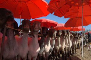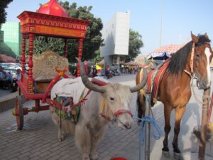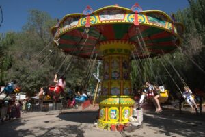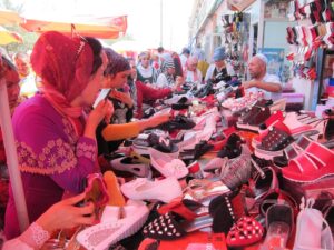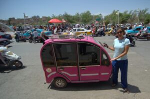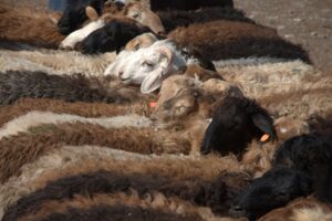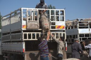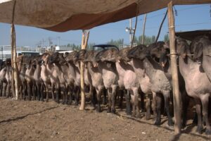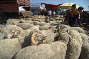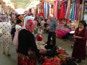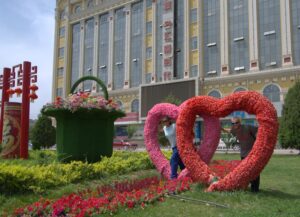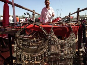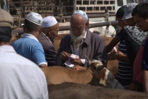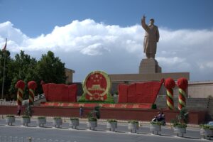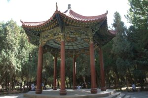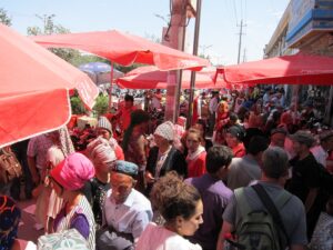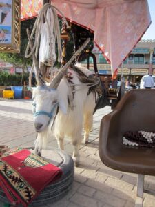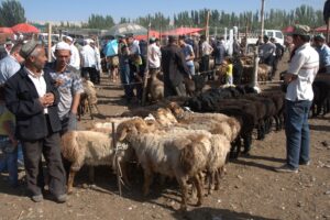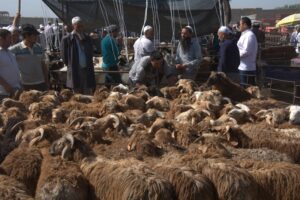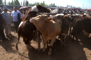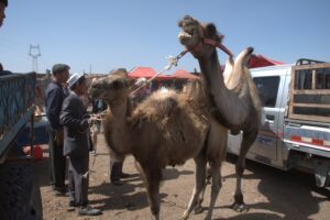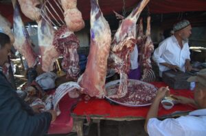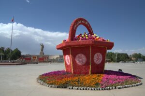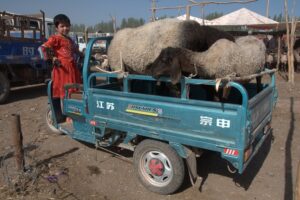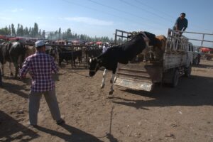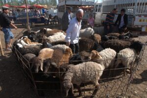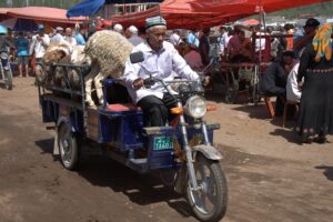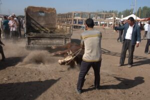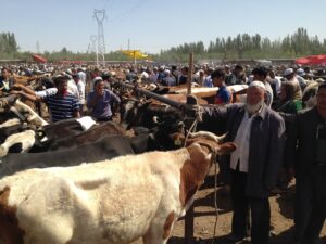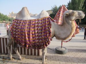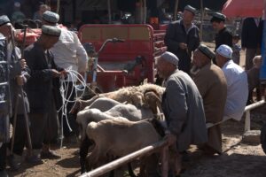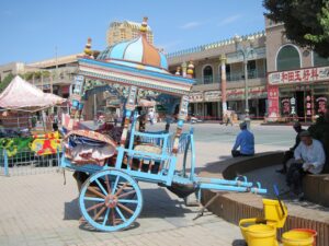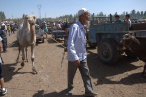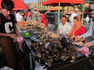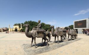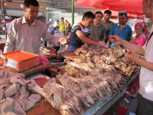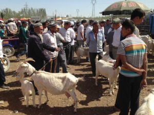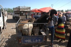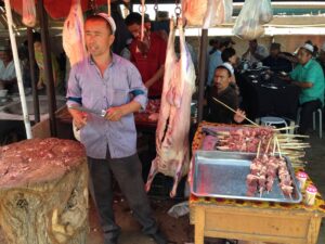 10 Jul – Despite Tom’s guarantees that things would improve, we tried to have breakfast at the hotel affiliated restaurant again and were served the exact same crap breakfast. This time, everyone’s patience had worn out so the majority of the group stormed out angrily when we saw was happening. Why is it impossible to get bread in Kashgar when there are plenty of vendors selling round pockets of bread throughout the city? We don’t want sliced cake and tomato slices for breakfast…in what country is that normal!? Kate went back to the truck and put out some bread and spreads for anyone who wanted it. This morning we were headed to the famous Kashgar Sunday market and we were looking forward to it. Our group hopped into several taxis for the short ride out there. By 10:30 am, the livestock market was a happening place. There were lots of sheep, cows, goats, donkeys and horses. 3 camels even made an appearance towards the end of our visit. Visiting the Kashgar market even today is a scene you could imagine playing out several hundred years ago. Traders from multiple countries speaking many tongues and wearing unique clothes all intermingling, haggling and conducting business today…it was magical. For the animal lover in us, the market was disheartening…the animals are not kept in humane conditions. But it was a colorful, exciting and brilliant visit nonetheless, and definitely a highlight of Kashgar. For lunch, we grabbed several oven-baked lamb dumplings (delicious) and we were back at the hotel by 1 pm. The rest of the afternoon was ours to do what we liked so we headed over to the People’s Square where we got to see the largest Mao statue in China. The People’s park had an amusement park with lots of crazy (unsafe) rides so we opted to skip those and people watch instead. For dinner we went to the restaurant that Tom took us to for our first group dinner. Young Gill, Kate P and Andy were already there, and Ant and Denise joined us a few minutes after we had ordered our meal. Good food and plenty of it since the two of us were sharing 2 dishes. Back at the hotel, we decided to take advantage of the decent Internet to call home. Not sure when we will get another chance to get online since we will be bush camping for the next 5 days.