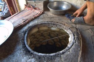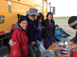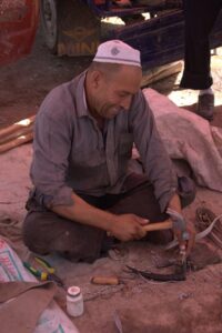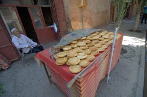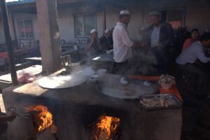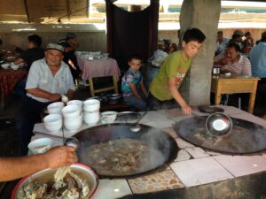 08 Jul – When Robby got up early for cook group, there was a thick layer of morning frost on the tent. This was definitely the coldest morning we have had on the trip thus far! It was still dark when we were ready to depart just before 7 am, which is probably the reason why Denise didn’t see her iPad when she inadvertently rolled it up in her tent! As Kyle was getting ready to depart our bush camp, Denise cried out in dismay that her iPad was missing and the search was under way. Thankfully, someone suggested it might be in her tent so early morning crisis averted. Kudos to Denise and Ant for being able to pack away their tent with an iPad in it!! No idea how that is possible but they managed to do it, ha ha. Everyone bundled up in their warmest gear for the morning drive, so it was a quiet and subdued affair on board Habibi. We stopped for lunch at the same place we stopped at on the way to Lake Karakol. Little did we know that the time that we were going to be the subject of intense scrutinization and amusement. Our lunch stop prompted several locals to pull over, hop out and come over to check us out. Our every move was being recorded and what was bizarre was no one actually talked to us. They just invaded our lunch spot and proceeded to analyze everything we were doing. It was all a bit too much, especially when one of the bolder guys started digging through our food and calling his family to explain the strange salads that we were eating. We had to draw the line when they decided to hop up on Habibi to go through all our stuff. They appeared nonplussed when they were furiously told they were NOT allowed to just wander through our personal effects! Their behavior was borderline comical but definitely rude, and the endless curiosity got old fast. After lunch we drove back to Kashgar and checked into the Seman Hotel again around 3 pm. We were both rather hungry so we head over to the Pakistani joint across the street for an early light dinner of dumplings and mutton stew with chapatti (yum). Greg and Molly joined us but were disappointed since the dal they ate here the first time was better than what they got today. After dinner we returned to the hotel and relaxed for the remainder of the day.