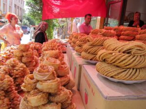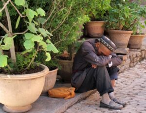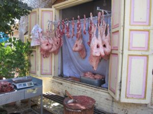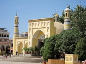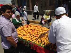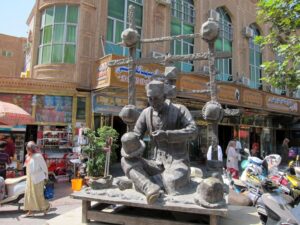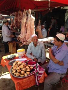 05 Jul – Got up for breakfast at 9 am which sounds later than normal for us on this trip but it actually seemed like 5 am when our alarm went off this morning. The hotel has an arrangement with Ali Mustafa Restaurant to provide breakfast and yesterday evening, Tom coordinated for our group to have breakfast. However, when we walked over, surprise, surprise…Ali Mustafa restaurant was closed. About an hour later they finally got the staff in and we were served some tea right away. Then things went downhill from there. We were actually served some cake slices, watermelon and tomato for breakfast! Incredulous and in disbelief, we asked if there would be anything else and the staff begrudgingly said we could also have eggs. Tom inquired if they could serve us some bread and instead we were given yet more cake and jam. What a joke. Our bizarre first breakfast in China left a lot to be desired to say the least. Then we were off to do our walking tour of the city, but first we had to stop and pick up several members of our group who decided to opt for the bank to change money. We did the math and calculated that the bank would have offered about $2 more per $100 changed versus using Kate’s money exchange connection in the hotel lobby. It was insane that we sat and waited for over an hour for part of our group to exchange their money. The kicker was that after wasting the group’s time for the better part of an hour, no one had been able to exchange any money! Sometimes being part of a group sucks balls and this was one of those times. Our first morning in China was proving to be an exercise in patience and we were failing the test! After everyone regrouped, we walked across town to the Mosque, then through the bazaars of the old town, out the gate and onward to the Sunday Bazaar. On the way back we stopped for a late lunch of noodles and mutton with veggies. Young Kate ordered a vegetarian dish and our waiter nodded his head reassuringly. Then he brought out another mutton with veggies dish for her. Tom repeated her request for a vegetarian dish and poor Kate had to wait for everyone else to eat while she patiently waited for her food. When we were done eating, Tom finally asked the staff what was going on and we were shocked when they responded that the chef was busy and he refused to make a special meal for her. When Tom went back to plead her case, he asked for any kind of sauce or something to accompany her pasta. Guess what? The staff picked most of the mutton out of the original dish and gave Kate the same exact meal they had already tried to give her over an hour ago! Kate is a champ though…she had to pick out a few extra pieces of meat but wasn’t fussy about it at all and we didn’t hear her complain about it once. After lunch we continued on our walk through Kashgar and eventually ended up back at our hotel. We were finally able to use a VPN to check Facebook and Gmail which was our minor success for the day.