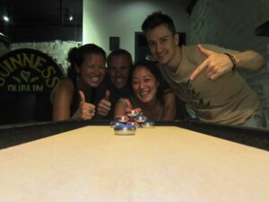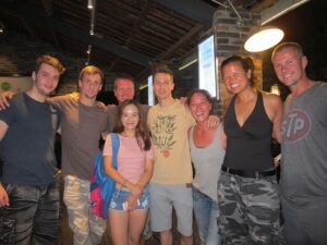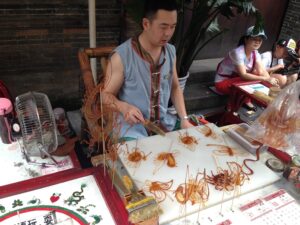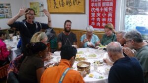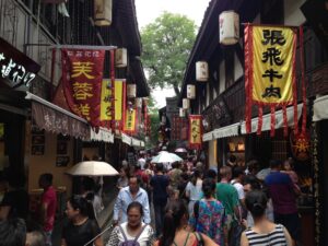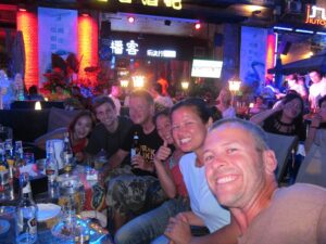 28 Jul – After breakfast, we linked up with Tom at 10 am for a Chengdu city walk. He led us to the tourist district of the city and then told us we were on our own…not a great tour! So we decided to partner up with Lars and Ichi to explore Chengdu on our own. First heading to the People’s Park and then to Jinli Ancient Street, which were both worth a visit. On our return trip back, we stopped for lunch at a noodle shack. Back at the hotel, we chilled until our reunion with Scott (one of our TransAfrica buddies who has been living in Chengdu for the past 4 years). He was supposed to meet us at the hotel but forgot all about the time so when Ichi called him, he asked if we could meet him at the Joy Yard Restaurant instead. A short taxi ride and we were there. It was so great to see Scott who hadn’t changed a bit. We also got to meet his girlfriend Doris, brother Adam, and cousin Paul. Doris ordered a nice mix of food for the table and we all chowed down. Excellent food here! After catching up on the past couple of years, Scott presented us with an assortment of “gifts”. First present was a pack of cigarettes and lighter because it is common to offer cigarettes to people in China whether you are a smoker or not. Next up was a bottle of rice wine (which we had already had plenty of and were not huge fans of), followed by a massive ladle since that is what was traditionally used as a drinking container by poor Chinese who had traveled a long way. Interesting Chinese gifts but we will certainly be re-gifting ours, ha! After dinner we went to a pub called “The Beer Nest” for a few tasty beers and then headed over across the street to McElroy’s Irish Pub for more drinks and some games. Scott pulled some strings and coordinated for the Pub to open the upper floor so we could play some games (pool, darts and shuffle board) while we drank a mini keg of beer. Good times and we forgot how much fun Scott is! All too quickly, the bar closed so we had to say our goodbyes and returned to the hotel.