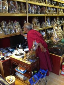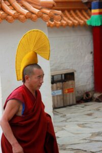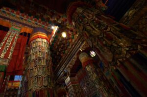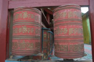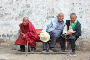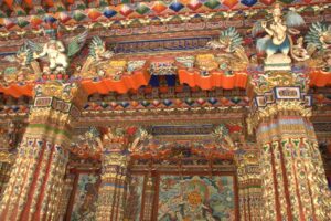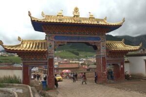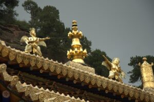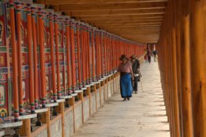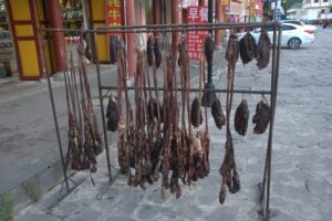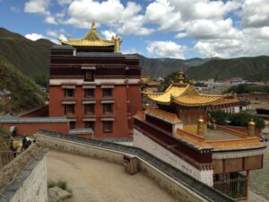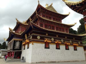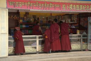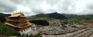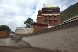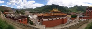 24 Jul – After breakfast, we headed over to the Labrang Monastery complex at 8:30 am. Since Tom told us our guided English tour wasn’t until 10 am, we had some free time to wander around on our own. After visiting Lhasa in Tibet back in 2008, we were shocked to see so many tourists here in Xiahe. The number of tourists (especially domestic tourists) has increased exponentially and we don’t know how the monks of Labrang Monastery put up with all the annoying camera toting, selfie taking tourists. Our 10 am guide was a no show so we hung around waiting. All the English tourists had been lumped together into one massive group and by 10:30, our monk guide showed up and we were off for a quick tour of the complex. Our guide was quite taken with Denise and agreed to a selfie pic with her but when Lars asked for a ponder pose, the monk angrily refused and his friendly demeanor switched off. We really didn’t enjoy being part of such a large group to explore Labrang so as soon as the tour was over, we split off to do our own thing. Which mainly consisted of climbing a nearby hill for a nice panoramic view over the city of Xiahe and the Labrang Monastery followed by some lunch. Our original plan was to eat at Gesar Restaurant, but as soon as we saw the disgruntled faces of our group (they had been waiting over an hour for their food), we turned right back around and found a local joint that served up some delicious noodles within mere minutes. After lunch we circumnavigated around the Labrang Monastery complex, spinning prayer wheels as we walked along before heading back to the hotel to relax for a bit. Tonight was a repeat of last night as we headed over with Lars and Ichi to the Gesar Restaurant. Again, the place was empty and we had it to ourselves over an enjoyable dinner. Two thumbs up for Xiahe…we really enjoyed this town.