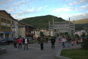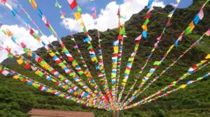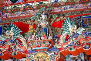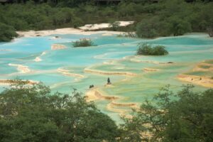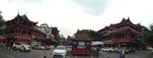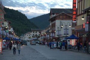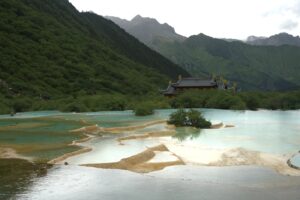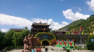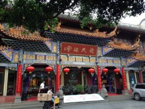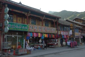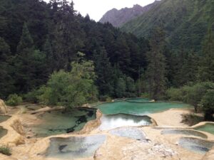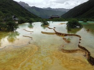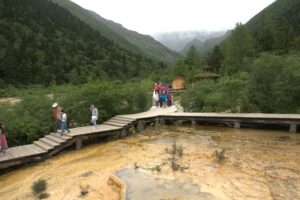 26 Jul – After an early breakfast, we were on the road by 7:30 am for a cold and wet drive to Chuanzhusi. Due to the inclement weather, we weren’t sure if this afternoon’s excursion would be a go (a visit to the nearby Huanglong pools). By lunch time, we made it to Chuanzhusi where we checked in at the Jinjing Hotel and waited to see if the weather would clear up for our visit up the mountain. A group of eight of us joined Tom for lunch at a local restaurant which served up some tasty meals. Back at the hotel at 12:30 pm, we linked up with the group to discuss whether we would visit Huanglong (Yellow Dragon) pools or not. In the end, everyone except Warner, Denise, Andy and Kevin decided to go. Kyle drove us in the truck, and it took us about an hour to drive to the park. Luckily for all of us, Kate ended up paying for our cable car ticket up with local payment so there were no other costs for our afternoon excursion…yay! We did have to wait in a long queue to get on the cable car, but the line moved quickly. The ride saved us a 30 minute hike up the mountain, but little did we realize that it only took us up part way. There still was quite a bit of hiking to do but it wasn’t too bad. Definitely not bad enough for the stalls that were selling oxygen canisters! We laughed at a couple of Chinese tourists we saw puking over the side of the railing due to altitude sickness…seriously? We were only up 3600 meters!! There was a light drizzle of rain for most of our visit to Huang Long but the colorful pools were still worth a visit. Kate had coordinated for us to be back at 5:30 pm, so we felt a bit rushed in our desire to see everything, springing up the stairs and trying our best to bypass the crowds. And by crowds, I mean crowds. This place was packed with thousands of tourists, and everyone was stopping frequently with those damn selfie sticks and umbrellas. With so many inconsiderate tourists blocking the walkways, it made getting around a bit tricky but we managed to sprint around and see everything and make our way down to the meeting point with 10 minutes to spare. In the end, our rush was for naught, as quite a few members of our group decided to show up at their convenience so we had to wait an extra 45 minutes for the last stragglers to filter on in. Tom called Kyle to come pick us up and we were off, returning back to Chuanzhusi late in the afternoon. With the remaining light, we wanted to walk around and explore this interesting city, so we immediately set out to check out the temple before making our way to the other side of the river for some dinner, yak noodle soup style. It was nice to see the Tibetan influence on the architecture in this town, and we laughed at the humorous Chinglish translations on many of the buildings. After dinner, we called it a night and headed back to the hotel.