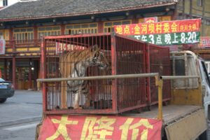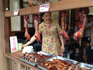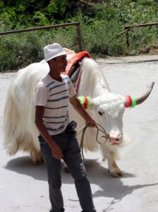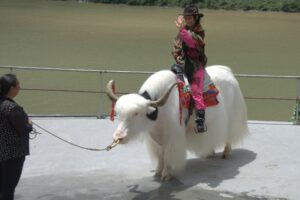 27 Jul – We had a bit of a lie in today with a 9 am departure! About 10 minutes after we hit the road for the long ride to Chengdu, Tom remembered that he had forgotten to get his hotel deposit money back, so Kyle had to backtrack. This slight detour ended up costing us dearly, as we ran into a traffic jam that delayed us over an hour. The reason? A truck had overturned and a crane was needed to flip it back over. All traffic had come to a standstill and we learned how impatient Chinese drivers are! Our lunch stop was near Shuangquan where Kate found a restaurant for us to eat at (paid for with local payment). The girls took a funny group pee photo in the ladies’ bathroom since the dividers were so short with Robby serving as the photographer. Who knows what the locals must have thought we were doing in there?! Our drive today was quite scenic with mountains all around as we drove along the river in a deep gorge. Becky and Connie spent the afternoon spotting Chinese ladies with intricate traditional hats but weren’t able to get any photos. We did pass by a couple of villages capitalizing off of white yaks – dressing them up for tourist photos. By late afternoon, we finally reached Chengdu and checked into the Lu Jian Hua Hotel. Tom offered to help us order dinner so we went with Kate P, Kate F & Kyle and enjoyed a nice cheap dinner. A couple of other stragglers showed up after we had ordered and they had to point at photos on the wall to order their food since Tom had already left for his apartment. Unfortunately, the photo meals looked a lot better than what was served, so the group was stuck with a couple of mystery meals. While we were having dinner, we heard of some drama involving Daniel and the police. Apparently he had been escorted back to the hotel for causing a scene, and he had denied knowing anyone else in our group when Ant tried to intervene and assist…how bizarre! We were glad to have missed the drama since it didn’t involve us at all!