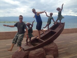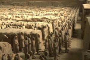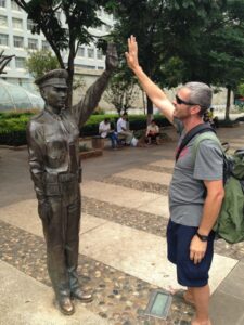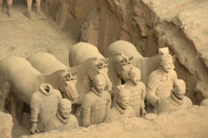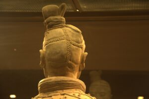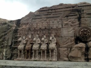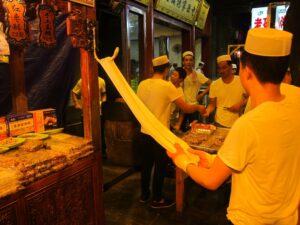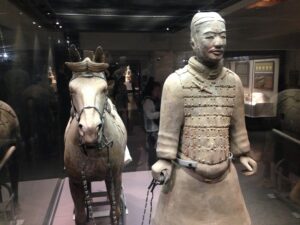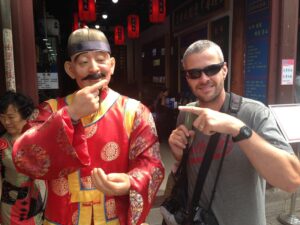 Chinese oil sticks (“fried bread”), yogurt, dried fruit, eggs, toast with butter or jam, and a selection of fruit…fantastic! The hotel had coordinated for an early breakfast for us but they were super strict in collecting our breakfast coupons. Apparently, we were supposed to have one each and the staff gave us a really hard time since we didn’t have a second breakfast coupon. After breakfast, we took Habibi for one last whirl to visit the nearby Terracotta Warriors. We were joined by a new addition to our team, Teresa from the US. She was a trip! The stereotypical bleach blonde from California, Teresa was now living in Singapore off of a more than generous divorce settlement. She joined our group at the last minute and didn’t have a clue what she was in store for. No idea about overlanding or the fact that we were now leaving the truck and would be taking public transportation everywhere. Becky had a nice chat with her and found her to be super friendly and nice, but also quite ditzy and unable to string along more than one coherent thought at a time. She will definitely make an interesting addition to our group! The Terracotta Warrior complex wasn’t opened yet when we arrived, so we had to cool our jets. Kate gave us a total of 4 hours here, which was more than plenty. It was stifling hot by mid-morning and we were on a quest for AC as we walked around. Since we had already visited before, it didn’t take us long to see everything again. The site has become even more crowded than before, which we did not think was possible. While the warriors are as impressive as ever, the inconsiderate tourists hogging all the space around them for the ultimate selfie shot quickly grew old. Seriously how many selfies with the warriors does one need? The pits were crowded enough, but getting up close to see the bronze horses and carriages on the bottom floor of a nearby museum was ridiculous…definitely a fire hazard with thousands of visitors pushing up against each other for one quick glimpse. The 360 degree theater looked old and dilapidated and is in need of an upgrade. After sightseeing, we followed Lars around as he shopped for his very own warrior replica, settling on one of the General statues. It was lunch time when we decided to wait for the group at the truck and of course we had to stop by McDonald’s for a quick snack. Actually the thought of a milkshake lured us in but no milkshakes were to be had so we settled on a chicken burger instead. Back on the truck, we had to wait around for everyone to regroup. Lars showed us a pic of his half sized warrior…what a heavy souvenir but he got free shipping so not a bad deal! Everyone felt a bit nostalgic as we realized this was our last ride on Habibi…she had treated us well over these past few months. SCUBA Gill and Becky spent time staring out the window at the Chinese phenomenon of men wearing their t-shirts raised up over their bellies. Not a good look for many of them! Back in Xi’an, we bid a final farewell to Habibi and had a quick meeting with our new tour leader, Tig, at the hotel before zipping out to lunch with Lars and Ichi. It was super hot outside so we were more than happy to chill in our room until dinner. We did manage to drop off our trip questionnaires and tip money/thank you notes to Kate and Kyle before heading out to dinner as we really didn’t want to forget to do that. Tonight was the farewell dinner with the entire group and we walked over to a restaurant that specializes in hot pots. Basically, there is one large bowl (filled with clear broth) that is heated from center of the table. The bowl has two portions, an inner portion of clear broth and an outer portion filled with a hot chili broth. The staff brings out trays filled with various meats, veggies and other goodies that you throw in, cook and consume. There was a sauce and spice station where you could load up on garlic or sesame oil, chilies or any other condiments. It was a tasty treat but we aren’t used to having to “cook” our own food at a restaurant! After dinner we pooled together tip money for Tom (which was a bit weird since we still have another week to travel with him) and had thank you speeches for Tom, Kyle and Kate. Most of the group decided to head out to Marley’s Bar across from the hotel for after dinner drinks but we were on a quest to find a fan at the Muslim Quarter. Gill wanted one too since the weather had turned stifling hot these last couple of days. Our post-dinner stroll took us past the Clock Tower, the Drum Tower and through the lively Muslim Quarter’s night market. We were shocked things were still lively despite the late hour (11 pm). Then we surprised the group by joining them at Marley’s Bar. Based on Lars’ tip, we ordered a pitcher of mojito which was lovely. There was bit of dancing and rice wine drinking and lots of fun. Lars and Kate swung those hips and danced on end, earning applause from the Spanish contingent who had joined the bar. Once the music switched to salsa, they showed us how it was done. Fun night…we are going to miss this lovely group. Around 2 am, we finally called it a night and returned back to the hotel with young Gill who was also keen on some shut eye.