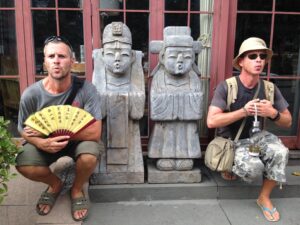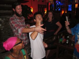 07 Aug – Last full day in China! After over a month in this vast country, we were ready for someplace new. After snacking in our room for breakfast, we checked out and hopped into a taxi back to the bus station. Today’s bus was the standard two-seats on each side of the isle with the baggage in the underside cargo area. The driver crammed in tons of extra cargo on either side while we tried our best to keep an eye on our group’s bags. The last thing we wanted was for one of our bags to be offloaded so more cargo could be stored and left behind! Today’s ride from Kunming to Mengla was pretty scenic, with lots of terraces carved into the surrounding mountains. Unfortunately, we had rain for the majority of our trip. But when we arrived in Mengla late at night was when the real show began…torrential rain started pouring down. This was the hardest rain we have seen on the trip and it was relentless! All of us huddled together under a flimsy awning in uncertainty because there were no taxis and we were wondering what the hell was going on. Finally, a mini taxi van showed up and grabbed the first group. No way we were all squeezing into the first taxi so we patiently waited, and waited, and waited. About an hour later, we were picked up and taken over to our night’s lodging at the Xiong Feng Hotel. The streets were flooded but at least the rain had eased up slightly. When we arrived, Tig had already checked in and gave us our room key. Despite the late hour, we were hungry so we dropped off our bags and quickly went out in search of a bite to eat. Thankfully, a small noodle shack was open so we grabbed a quick dinner before taking a shower and hitting the sack.