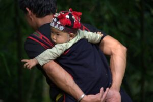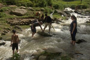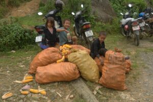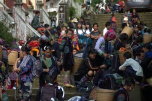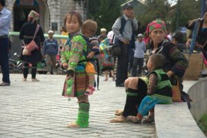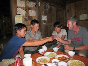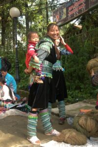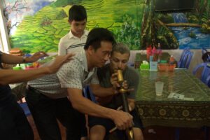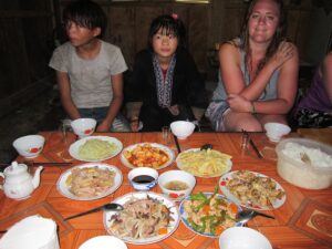 21 Aug – Imagine our state of mind when we got roused at 1 am for an announcement over the PA system informing us that due to flooding further on the track, the train had to stop. Of course we ignored it and kept sleeping! But soon conductors were banging on our cabin door so we knew it was futile to resist. We offloaded in the middle of nowhere and made our way to awaiting buses. Not enough buses had been organized for the train passengers, so we were lucky to find a bus that could fit all 9 of us. As the buses started to overfill, one of the attendants tried to take matters into his own hands, attempting to force a 5th person to sit/squeeze in the middle of the 4 of us jammed into the last row of seats (Ant, Helen and the two of us). Once we realized what he was trying to do, Helen was having none of it and got really vocal until the guy finally gave up. Later he tried to do the same thing to Gill but she adamantly refused to have a stranger sit on her lap for the duration of the bus ride! In the end, the train staff had to huddle together uncomfortably on the bus steps for the 45 minute ride to our drop off point. When we finally arrived to the next train station, we loaded back onto the new train and tried to get a couple of hours of shut eye before our arrival into Lao Cai. What felt like 2 hours later, we pulled into the Lao Cai station. Amazingly, the early morning fiasco of switching trains coupled with a bus ride did not appear to have caused us a significant delay. Tig had arranged for us to trek in Sapa with a company called “Sapa O’Chau” and they had a driver waiting to pick us up for the drive into Sapa. For some reason, Robby’s name was listed as tour leader for our group instead of Tig’s! The drive from Lao Cai to Sapa took under an hour on some mountainous and curvy roads and our driver deposited us at the Sapa O’Chau office. There, we were told we had a few hours to kill before our guide showed up, so we headed into town for some breakfast. Everyone else decided on a western style breakfast but we were keen on some pho so we split up. At the first local joint we found packed with locals, we ordered two steaming bowls of chicken pho…yum. One of the guys were smoking what appeared to be the largest tobacco bong we have ever seen. Robby asked to take a photo of it and was immediately invited to take a hit. A foreigner wanting to take a hit of the bong? That was too much for the locals who suddenly swarmed around Robby trying to teach him how its done. Robby took one puff, immediately became pale faced, light headed and queasy. Definitely some strong shit! After sitting down to make sure he wouldn’t pass out, the guys all started laughing, forcing water down his throat and wiping down the beads of sweat that had suddenly appeared on Robby’s face and arms. Then they started taking photos…both with and of Robby who had quickly become a minor Sapa celebrity. Too funny! Pretty soon Becky got pulled into the photo frenzy, with locals standing on chairs to be at the same height as her, ha ha. Once Robby recovered, we wandered around town until it was time for the trek. Sapa is a neat place. The town center was full of tribal women in their traditional outfits who were more than happy for us to take their photos. After linking back up with everyone at the Sapa O’Chau office, we met our trekking guide, Su. A jovial, easygoing 19 year old from the Black Hmong tribe, we liked Su instantly. As he led us through town, our group suddenly grew in size to double its original count. Yup, each one of us had our very own companion for the journey – the tribal women and girls would each claim one of us as their own and the others would immediately back off. We had heard about this prior to arriving but had no idea what to expect. Our new friends were very sweet about joining our trek and we were impressed with their level of English. As we wandered up and down the valleys, our companions would hold our hands across the more precarious crossings or point out something interesting to see. We were all mentally prepared for the hard sell later on, but it was pretty low key. When it came time for us to part ways, we were individually hit with a sale pitch for homemade handicrafts and jewelry. Becky succumbed to a small purse and bracelet which set her back about $3 (60,000 Dong). Amazingly, the weather held up nicely for most of the way. There were a couple of times that we had a light rain but we had wet weather gear and the sun soon started shining again. Lunch was at a small local joint that had phenomenal views overlooking the rice paddies. We enjoyed a nice mix of dishes and had way more food than we could eat. After lunch everyone was stuffed and contemplating a siesta, but we still had several more kilometers to go before reaching our homestay for the night. It was a sweltering day and everyone got soaked (not from the rain but from sweat!). The trekking itself wasn’t difficult, but the blazing sun made it uncomfortably hot. The landscapes all around us were very photogenic with amazing views of rice paddies…just wow! Throughout all the villages, the children would wave happily in greeting. There were piglets, chickens, ducks, buffalo and dogs roaming around freely around the villages. With all the recent rain it was a bit muddy in places, and we quickly learned that this area had been impacted by quite a few serious mudslides. Most of the mudslides were small but there were a few that were large and blocked the road or had pulled down power lines. We had to wade through the river at one point and there were lots of small nude children splashing around and having a good time. The kids obviously had no qualms about being naked together! By mid afternoon, we finally arrived to our homestay and met our hosts of the Red Dao tribe – May Sinh and Vang. They had 3 children but one was studying in Lao Cai, so that left 4 of them living in their simple dwelling. The ho