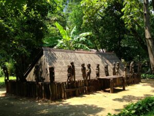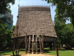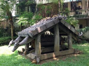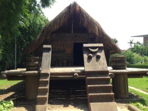 25 Aug – Yay! Today we were finally leaving Hanoi! But not until the late afternoon when we were scheduled to take a sleeper train to Hue. What to do with a full day in Hanoi? We wanted to check out its most popular museum, the Museum of Ethnology, which focuses on the 54 ethic groups recognized in Vietnam. Since it was located 8 km from town, we had to take a taxi there and we had a nice conversation with our driver who spoke excellent English. Wow, times are changing in Vietnam! The museum lived up to all its hype – it was excellent with hundreds of displays about the dozens of ethic groups living in the country. Out back in garden of the museum, there were 10 different styles of ethnic houses and dwellings. These were not to be missed! Altogether, we spent close to 4 hours wandering around the museum which is crazy since neither one of us are really into museums! Back at the hostel, we grabbed some lunch and joined the gang in hanging out in a 6 bed dorm room that Tig had coordinated for late check out. It felt great to take a cool shower to clean up before our overnight train ride. Then it was time to go and the Massive Hostel staff ordered 2 taxis for us, underestimating the vast amount of luggage that we were transporting. No way 2 taxis could possibly transport all 9 of us plus our gear, so Tig let the 8 of us go first and she hopped on a motorbike taxi to the train station. When the train to Hue finally arrived, we discovered that we were booked 6 to one cabin (Tig, Helen, Ant, Gill and the 2 of us) and 3 to the other (Lars, Denise and Connie). It was an insanely tight squeeze and our luggage barely fit in the cabin. Poor Helen and Robby were trapped on the top bunk and they had just a few inches to spare between them and the roof. Without a doubt, this was the most confined transport of the trip to date! Lars, Denise and Connie lucked out big time because no one joined their cabin of 3…so they had lots of room to lounge about. After a couple of vodka drinks in our cabin (everyone but Connie squeezed in), the gang wanted to keep the party going in the dining car. We opted get some reading on while everyone else partied on. Our sleeper beds were quite hard but it was comfortable enough to get some shut eye. Onward to Hue!