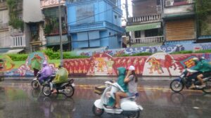 19 Aug – Free day in Hanoi…what to do? First was breakfast with the group on the first floor. We were unlucky enough to arrive to Vietnam as a typhoon was set to hit North Vietnam later today, explaining the torrential rain we got last night and were projected to receive all day today. Tig held a quick meeting to discuss our upcoming itinerary to see what we all wanted to do. Everyone except Denise was keen on Sapa and everyone except the two of us wanted to visit Bai Tu Long Bay (an alternative to Halong Bay). After breakfast, we decided to brave the elements and do a bit of sightseeing around Hanoi, despite the inclement weather. First stop was St Joseph’s Cathedral. Next was a walk over to the longest ceramic mural in the world but the rain was relentless, making for a miserable morning. Finally, when we backtracked to Hoan Kiem Lake, we decided to let mother nature win the battle. Our rain ponchos had long ceased to be effective, we were dripping to the bone, and we weren’t enjoying Hanoi. So the consolation prize was to check out the water puppet theater where we ended up booking tickets for the 3 pm show. With over 4 hours to kill, we wanted to see what Hanoi’s famous food street district was all about but we didn’t want to trudge outside much longer. So we head back towards our hostel and ended up having lunch at the popular Pho 10 restaurant that was packed with locals. Meanwhile, Lars had an equally unproductive day and he joined us mere minutes after we got back to the room. We all relaxed until the water puppet show and Lars tagged along to see if he could score a last minute ticket (lucky bastard scored a seat closer to the action than we did). The show was better than expected and lasted about an hour. Afterwards, we decided to suck it up and hit the food street area but found to our dismay that everything was shuttered up due to the rain. There was one restaurant offering lunch specials so we did manage to get some tasty food before stumbling across Gecko, a restaurant that lured us in with its happy hour promotion (2 for 1 cocktails). Since the drinks were quite good, we mistakenly believed the food would be too. Our “King Size” pizza was disappointingly small and could have been a personal pan sized pizza! Definitely a good thing we had eaten already or there would have been 3 very grumpy and irate customers, ha. The rain wasn’t letting up so we decided to buy some beer at a convenience store for drinks in the room. A couple of hours later, Tig and Gill were up for a night around town at a place called “Legends” so Robby and Lars joined them. From Legends the group went to beer street “Bia Hoi corner” on Ta Hien Street where a big glass of beer was 5000 Dong (25 cents). Robby and Tig had the munchies so they got a late night snack at a street shack along with shots of rice wine for all. Take that Typhoon Dianmu – you aren’t gonna ruin our night!