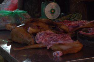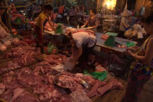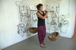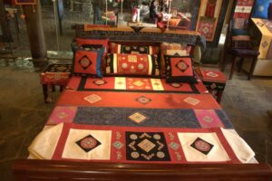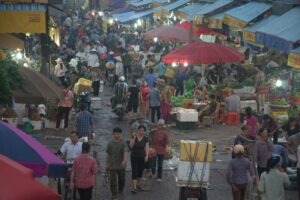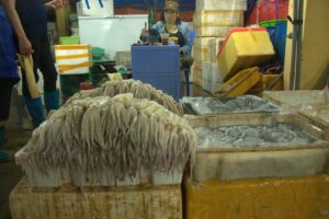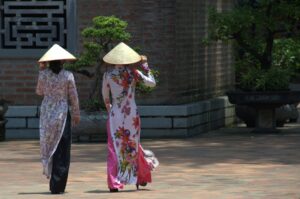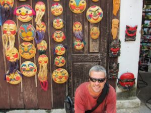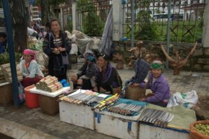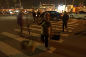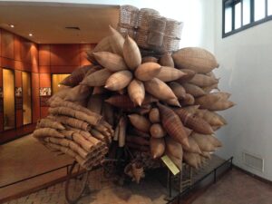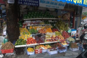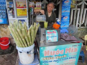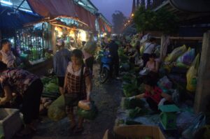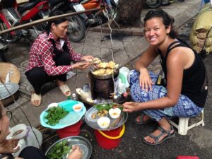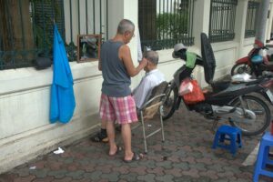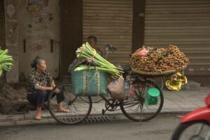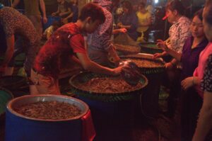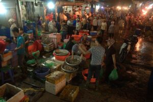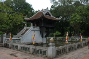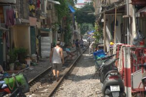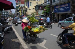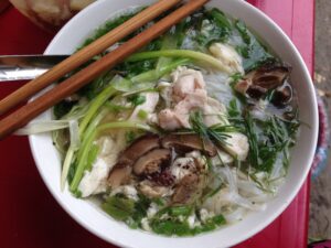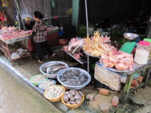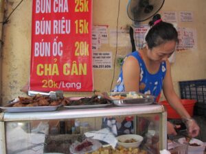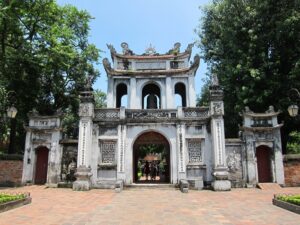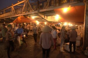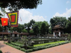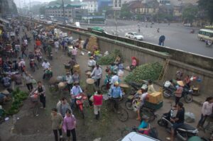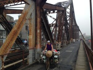 24 Aug – Up at 4 am to see the Long Bien Market and Bridge. Hanoi was really quiet at this time, as you would expect. However, once we crossed the road to the market, the world exploded as there was total chaos and mayhem – the morning market was in full swing. Thousands of people on foot, motorbike or bicycle were all carrying heavy loads and systematically weaving around one another to deliver products. We had to struggle to get out of the way or risk getting run/walked over! No joke…don’t mess around at this morning market. After spending hours observing the frenetic pace of the market, we left at sunrise. The market was winding down anyways. We had read online that it is busiest from 2 – 6 am and can certainly attest that to be the case. After our morning market adventure, we walked across the bridge, which offered a phenomenal view overlooking the madness below. Then it was time for breakkie and we discovered the best street pho imaginable. Pho ga served with mushrooms and onions…talk about some serious yum! We’d go back to Hanoi in a heartbeat to taste that pho again. Best we’ve had in Vietnam and that’s saying a lot. Our after breakfast snack was a fried sticky rice cake stuffed with pork and bean paste…not bad. Then it was nap time at the hostel for a few hours before we finally roused ourselves to visit the Temple of Literature. Sightseeing complete, we had bun cha for lunch from a street vendor, cheap and delicious. Then it was off to the highly recommended Vietnamese Women’s Museum. The sweltering afternoon heat caused us to spend several hours here which was easy to do since the
