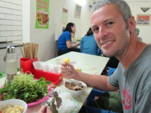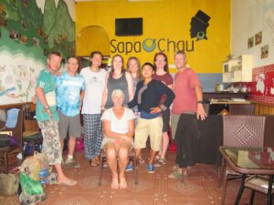 22 Aug – We were up by 7 am and had some tea and coffee. Vang was supposed to be in charge of making pancakes for us this morning but apparently he had too much to drink last night! Poor Vang and naughty Robby!! Su told us that last night, he had to help carry Vang to his bedroom. No brainer that Vang would want to sleep in a bit this morning. In the end, Su volunteered to make the pancakes so that we wouldn’t be delayed this morning. After breakfast we took photos with and thanked our lovely hosts before bidding them goodbye. Su gave us 2 options for our day’s hike. First option was a short 7 km walk down hill to the main road where we would then catch a bus back to Sapa or the second option was to hike all the way back to Sapa. After a quick vote, we unanimously chose the short hike. The morning walk was nice as it was not as hot as yesterday and we only experienced a very light drizzle of rain. We took our time on this morning’s hike as there was no rush. Poor Gill’s throat was killing her, so after we got picked up on the main road, Su arranged for us to stop at a pharmacy so she could stock up on some drugs. Back in town, we were dropped off at Sapa O’Chau’s office where we hung out in the office and stayed out of the rain (it picked back up right when we pulled into town). The staff kindly invited us to take scalding hot water showers in their office next door (bliss) and we quickly freshened up. Then Su made us fried egg sandwiches for lunch before bidding us farewell. We insisted on a group photo before thanking Su with a tip. He made our 2 day trek in Sapa quite enjoyable with his positive attitude and friendly demeanor…two thumbs up for Sapa O’Chau! We would highly recommend trekking with this company for anyone interested in visiting Sapa. When the rain finally eased up in the afternoon, we made a quick break for town, scoping out the souvenirs. While tempted, we just couldn’t fathom carrying any more weight in our backpacks so we resisted the urge to buy anything. After all, we’ll be back to Sapa and will have plenty more opportunities to buy stuff here. At 3:30 pm, we hiked down to the main church in Sapa where Tig was told we would catch our bus back to Hanoi. Wrong info! The bus station was not in sight (nor the bus). A frantic Tig ran around town to search where we had to depart from and came back with the info that we needed to hoof it another 2 km out of town. The taxi drivers sensed her desperation as they quoted ridiculous amounts to transport us such a short distance. Refusing to pay the outrageous fee, Tig had us walk/run over to the meeting point where we discovered the bus was running late. No need to stress! When the bus finally pulled up, a mob of anxious tourists frantically bum rushed it, with everyone hoping to claim a comfortable seat. Since there were no assigned seats, it was a free for all with everyone grabbing the first available bunk. For some reason, we were kicked out of our initial seats since the staff wanted to reserve them for someone else. Rather than argue, we simply hopped to another bunk and settled in for the long ride back to Hanoi. This sleeper bus was what we remembered when we traveled around Vietnam in 2010. It is designed for short midgets and was extremely uncomfortable for us long-legged people. We had to contort our bodies to shift to a semi-comfortable position but it was a long ride as we tried our best to squeeze in some sleep along the way. When we pulled into Hanoi at 10 pm, Tig took mercy on us and hired taxis for the drive to the Massive Hostel. After grabbing our bags from storage, we checked into the tiniest room we’ve had on the trip thus far. The double bed barely fit into the room and we had very little space to store our gear. Later when we checked out Lars and Gill’s twin room, we realized it was 3x the size as the double bed rooms. Oh to be single again! We were starving for some dinner but almost everything was closed in the old quarter. Tig joined us and we did manage to find a soup shack that served food for the next 15 minutes so we quickly ordered a meal and called it a night.