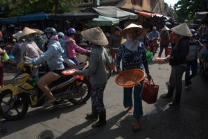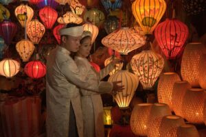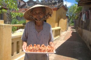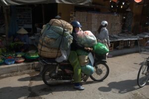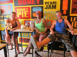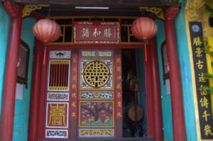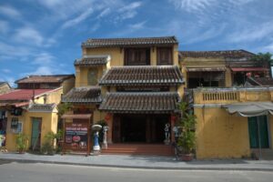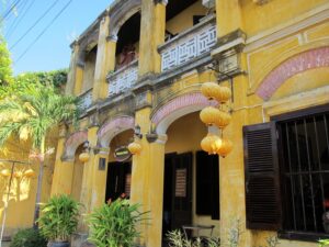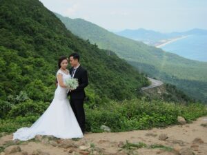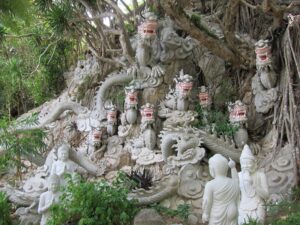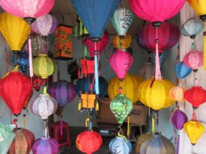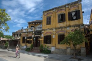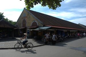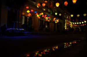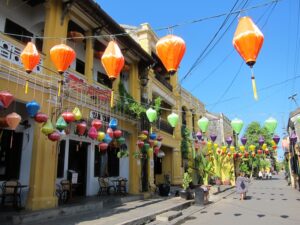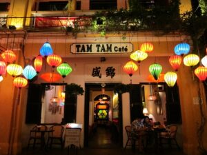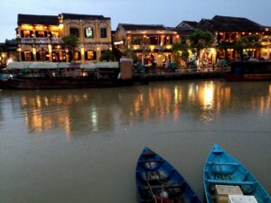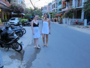 28 Aug – Breakfast was at a restaurant just across from the hotel where we got caught up with Connie and Denise (who had done the Hue river boat excursion yesterday). By 9 am, we were ready to go in our private van that was to take us from Hue to Hoi An (with a stop at Marble Mountain enroute). Helen and Anthony had decided to take a motorbike ride all the way town…which meant more space for the 7 of us in the van! From Hue we made our way to the Hai Van Pass (military bunkers) which was worth a quick stop for photos. Then we drove to Marble Mountain where we had some free time to explore. In mere minutes, we were sweating profusely from our hike around the mountain. The views from the top of Marble Mountain and its caves made our stop worthwhile. Then it was onward to Hoi An, our final destination of the day. Our driver dropped us off at the Thanh Binh II Hotel which was a nice base to explore Hoi An. Becky had scoped out a burger joint for lunch on Tripadvisor and led the gang there. Thankfully, it did not disappoint! Jim’s Snack Bar was the bomb with some amazing burgers and fries. Opened only a few months, this burger joint’s high ranking was well deserved, especially after meeting the humble owner in person…what a nice guy. Hoi An is legendary for its tailor shops so after lunch, Becky joined Gill and Denise for a walk around town to see if the tailors could replicate Denise’s Turkey skirt. Meanwhile, Lars and Robby just wanted to stroll about town. It was another super hot day, and we quickly sweat up a storm. After several hours of wandering around Hoi An, we were ready for some pool action. Gill joined us and we spent over an hour cooling down in the pool. At 7 pm, we joined the gang for drinks and dinner. It started raining but thankfully eased up as we headed out for the night. First stop was the bar just across the hotel where a glass of beer was only 5000 Dong. Tig mentioned having dinner at “The Chef” restaurant in town, which offered some fancy cocktails and a nice menu for dinner. More posh than we are used to but a nice upgrade from the norm! Then we had a bit of window shopping around Hue at night. Lars was interested in buying a miniature replica boat souvenir and after looking at the level of detail, we figured the asking price was pretty fair (especially since he could get free shipping back to Norway). Hoi An at night offered some nice photos, so we wandered around before calling it a day.