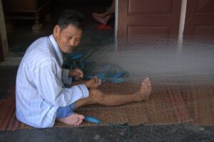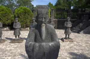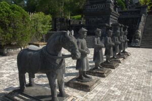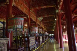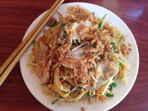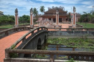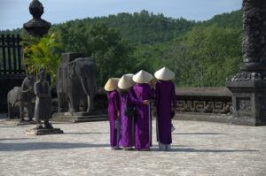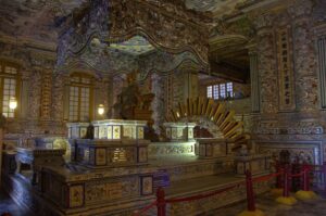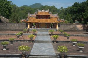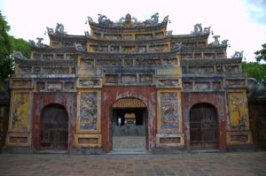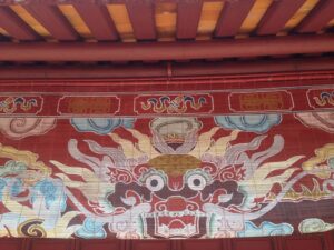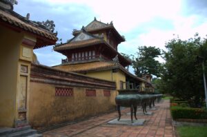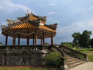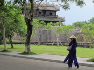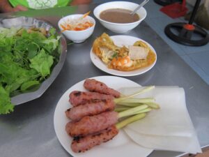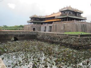 26 Aug – Our train pulled into Hue around 9:30 am. While waiting in the hot sun for Tig to sort out taxis to our hotel, we realized that Hue is a lot hotter than Hanoi! The sun was killer today. Eventually, we loaded into taxis for the ride over to Sunny B Hotel which was our home for the next 2 nights. The rooms were really nice – very posh and comfortable. The hotel staff offered us several tours and we opted to hire our own motorbikes for a self guided tour tomorrow. Robby was able to drop off his large backpack to be stitched up. The main strap was ripping apart from the excess weight that we had been carrying since we left the truck in China. Unbelievably, the staff contacted an old lady down the street who sewed it up in less than an hour. After admiring her handiwork, we decided to have her fix a small carry-on bag, a pants pocket zipper, and add an extra long strap to a purse. Then it was off to lunch at a restaurant the staff had recommended. Within walking distance, we strolled to Hanh Restaurant where we tried some of Hue’s specialties: Banh Loc (cassava, shrimp and pork wrapped in banana leaf and steamed), Banh Nam (rice flour and shrimp wrapped in banana leaf and steamed, served with sweet fish sauce), Nem Lui (grilled minced pork rolls on lemongrass stick with rice paper, greens and peanut sauce), and Banh Khoai (fried pancake stuffed with pork, shrimp, green onion, carrot, bean and sprouts served with greens and peanut sauce). Mmmm, good and cheap. After lunch we linked up with the group and walked to the Old Imperial City and the inner Forbidden City. We were able to purchase a combo ticket that included 3 tombs we plan to visit tomorrow so it was a good deal. This was our second time to Hue’s Imperial City. Quite a bit of the complex has been destroyed and fallen to ruins but they have done a great job of restoring some of it. Exploring the massive complex meant that the two of us got split up, with Becky joining Tig on a walkabout and Robby wandering around on his own. Since there are several exits, Becky and Tig waited for over 45 minutes at the main one but eventually decided to head over to the Dong Ba market for some street food. However, they ran into Helen and Ant who mentioned Robby was still waiting for Becky at the Forbidden city. Grrrr! It took over an hour before we were able to link up with each other…quite annoying to be wandering all around Hue trying to find one another. After backtracking to the market, we realized that the street food scene wasn’t what we wanted so we decided to walk back towards our hotel, stopping at various ATM machines along the way. None of them would accept our card for some reason (perhaps it was blocked?) so we figured we could call our bank once we got wifi. Dinner was at a restaurant near our hotel (Bun Bo Hue and Bun Thit Nuong). Once we verified our card was not blocked, we found another ATM nearby that other travelers had recommended. Success! We were finally able to take out 5 Million Dong in a single transaction so we should be all set for the next couple of days.