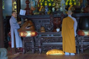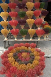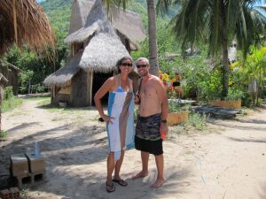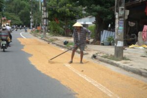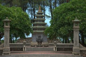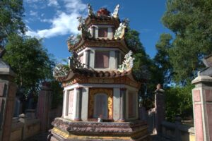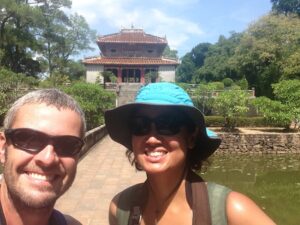 27 Aug – Our pre-arranged bikes were ready for us at 7 am but we quickly realized that the bike shop down the street was offering better bikes for cheaper so we opted to go with them instead. The sweat monkeys (our newly dubbed motorcycle gang since we were sweating a lot in humid Vietnam) rode off at 8 am. Gill, Denise and Connie had signed up for a boat tour, while the remaining 6 of us (Helen & Ant, Lars, Tig, and us) rode to the closest gas station to top off. Our first stop was the Khai Dinh Tomb. The stone bodyguards are worth checking out as is the interior tomb detail. Boy was it a scorcher today! We were completely soaked and it was still early in the morning. Next we had a quick stop for breakfast at a roadside shack. The noodle soup hit the spot. Next up was the Tomb of Minh Mang. It was OK but we liked the Khai Dinh Tomb more. Since we still had another tomb on our combo ticket, we decided to ride out with Helen and Ant to check out the Tu Duc Tomb. Meanwhile, Lars and Tig wanted to hit town to do some shopping and get online. We agreed to meet them at the Thien Mu Pagoda at noon. Tu Duc Tomb was worth a quick visit…Helen caught Ant sliding across the wooden floor in a slow-mo video which was hilarious. Near Tu Duc tomb, we rode past an incense village which was pretty cool because the incense sticks were arranged in colorful stacks. Next up was Thien Mu Pagoda (free entry) and we pulled up just as Lars and Tig arrived. This pagoda’s claim to fame is the car of the monk who burned himself to death in Saigon in 1963 as a form of protest against the South Vietnamese government’s treatment of Buddhists. From here, we rode out to Thuan An Beach. The Beach Bar Hue seemed to be the only place on the beach that had food and shade and we had to pay for entry. But, the entry fee counted towards any food and drinks that were consumed, so it ended up being an OK deal overall. The Sweat Monkeys spent a few hours in bliss soaking up the sun, swimming, and enjoying our cocktails and meals. By late afternoon, we decided to split up. Helen and Ant wanted to head back into Hue, and we were keen on visiting the Japanese Covered Bridge (Thanh Toan) with Tig. Lars wanted to hang out at the beach for a bit longer so we all did our own thing. Our ride out to the covered bridge was quite enjoyable as the sunset was spectacular. Navigating our way back to town on some narrow dirt tracks while in the dark was a bit tricky due to lots of road construction and diversions but we figured it out. After returning our bikes, we joined Tig for a massage at a blind massage center (1 hour massage for 60000 Dong). First we had to sit in a 15 minute herbal sauna, which was essentially a tiny room with a steam pipe that filters through lemon grass and other herbs. It was actually really nice although super tiny, especially for Tig and Becky who both barely managed to squeeze in at the same time. We enjoyed our massages but Tig demonstrated hers and we laughed as we realized she had essentially been gently stroked for an hour. Our taxi driver had kindly waited for us to complete our massages and he drove us back into town where we met the group at a bar by the hotel for a drink. The bar had a pool table so you know what Lars was busy doing! It was dinner time so we stopped at the first restaurant that looked appealing (Big Ben) and finished off our night with ice cream.