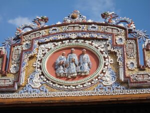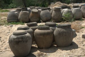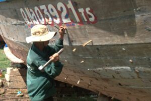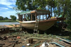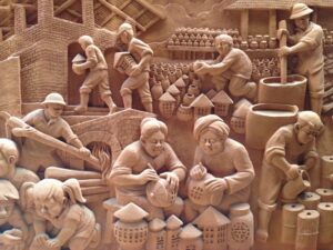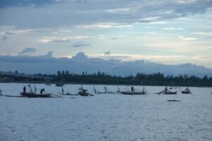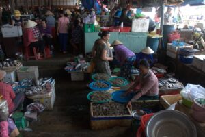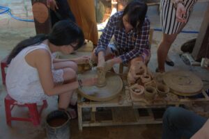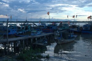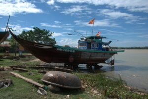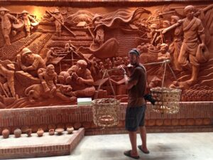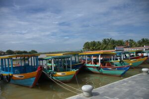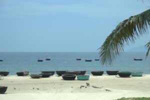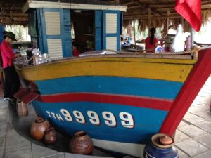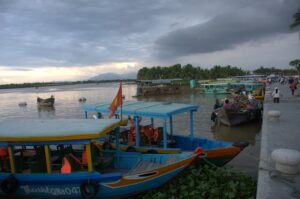 30 Aug – After enjoying the hotel’s phenomenal breakfast, we decided to hang out in the room as long as possible until checkout. Finally, at 11 am, we lugged our gear down to Tig’s room (she was keeping it for the entire day) and rented a motorbike for the afternoon. Our first stop was the Thanh Ha Terracotta Village where we were able to see how they make various types of terracotta pottery and other nick knacks. Then we went to the Terracotta Park, which was really the highlight of the visit. There were miniature terracotta world landmarks and buildings, an exhibit of terracotta artwork, a museum and a workshop where you can make terracotta objects yourself. Definitely worth a visit. Next was a stop at the Chuc Thanh Pagoda and Phuc Lam Pagoda, two temples that were supposed to be Hoi An highlights but we just thought they were OK. From here, we drove across the bridge to Cam Kim Island, which was home to the Kim Bong Carpentry Village. Most visitors opt to visit on a boat tour as the village is a bit hard to find but after zooming around the island, we eventually drove up on it. Not only were there carpenters (lots of wood carvings), but there were plenty of shipbuilders in this area too. We watched in horrified fascination as two shipbuilders started swinging furiously at each other, in an all our brawl that took place mere minutes after we showed up. Not wanting to get caught up in the drama, we drove off in search of nuoc mia (sugarcane juice) before heading into town for some late lunch. A row of hawker stalls met our requirement for cheap, filling and quick food before we zoomed over towards the Cua Dai Bridge and nearby fishing port. There were some cool cloud formations in the sky that refracted the light. End result was the sky had partial rainbow colors scattered around the clouds which was very cool to witness. Down by the waterfront, we checked out the fishing port and market area, easing our way through the market crowd. Then it was back to Hoi An to drop off our bike (well worth the $3 half day rental) before grabbing some drinks with Helen and Ant across the street. Gill and Denise joined us and we were convinced to join Gill for happy hour specials in Hoi An. There, we scored massive bucket mojitos for cheap which made for a happy afternoon. Back at the hotel, Becky was convinced to join the gang in grabbing burgers for dinner at Jim’s Snack Shack while Robby opted for cheap street food instead. After dinner, we squeezed in a quick shower in Tig’s room before our van showed up for the ride to the Danang train station. The train showed up an hour after we arrived and we discovered to our dismay that we were in 6 bunk cabins, and none of us had scored a bottom bunk. It was like playing a game of Tetris having to stack our massive bags on the floor in a configuration that would work. Thank goodness the 2 other occupants of our cabin weren’t there when we arrived as we had to manhandle their bags as well. It was a long night train from Danang to Nha Trang as our two bottom bunk room mates weren’t the most considerate with their frequent trips to the bathroom (and leaving the cabin door wide open) all night long.