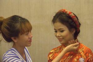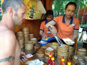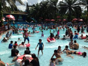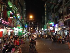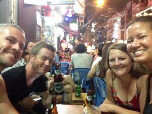 04 Sep – After breakfast at the hotel, we were off to the water park! Catching the bus (number 11) near the Ben Thanh Market was a breeze and cheap at only 5000 Dong. The Dam Sen Waterpark is the last stop so it is impossible to get lost. We inadvertently walked into the amusement park (adjacent to the waterpark) but were quickly pointed in the right direction. Becky had read online that the local women cover up with a t-shirt and shorts over their swimsuits so in an effort to blend in, she did the same. Good thing too because the only scantily clad women were foreign tourists who were getting ogled by the locals! We were told to head up to the second floor area for storage lockers (free) reserved for foreigners. No sunglasses, watches, cameras, etc are allowed to be taken on the waterslides so we dropped everything off at the locker and decided to check off every single ride at the park. What a fun day! Many of the rides probably wouldn’t pass safety inspections in the US but in Vietnam, anything goes. Since it was a Sunday, the place was packed but we didn’t have to wait too long for any of the rides. Lunch was dim sum and we were surprised it was so reasonably priced at the waterpark. After 5 hours of non stop water fun, we checked off every single ride and did our favorite ones multiple times. What a great day trip for Saigon! Catching bus #11 back into town was super easy, and we had worked up an appetite for a decent dinner tonight. So Becky went to Tripadvisor for their recommendation and found a place called “Ngọc Châu Garden” that was supposed to serve authentic Vietnamese food for reasonable prices. The food was good but prices were definitely geared for tourists not on a budget. And honestly, Becky has had better Vietnamese food from her mom’s homecooking. Lesson learned! We were still hungry afterwards and decided to revisit the alley restaurant we discovered last night. A plateful of spring rolls and two ice coffees later and we were feeling pretty good. A fellow diner helped us order our meal (he’s a Vietnamese guy who has been living in California for the past few years) so we started chatting him up and ended up getting invited to eat at his restaurant in San Jose for free whenever we were in the area. After dinner drinks were on Bui Vien Street which had transformed itself into party central after the sun went down. The happy hour drinks were a good deal and we managed to convince Tig and Lars to join us (they had just returned from a late visit to the waterpark and enjoyed it as much as we did). What a nice night to end our stay in Vietnam. Tomorrow we are off to Cambodia!