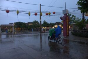 29 Aug – To beat the heat, we got up early for a wander around the old town and market for a few hours before returning to the hotel for breakfast. And what a breakfast it was! One of the best of the trip for sure. Our breakfast buffet was served at a sister hotel around the corner where the staff had laid out a massive spread of food. Eggs to order, tons of bacon, fruits and nuts, pastries and yogurt, juice, tea and coffee. We stuffed ourselves silly and then chilled in our AC room to beat the heat during the middle of the day. Everyone else went out to get outfits made. By early afternoon, we saw dark clouds on the horizon so we wanted to get out for a few photos before the storm. Boy it came pouring down! We managed to escape the weather by ducking into a nearby restaurant for some of Hoi An’s local specialties: Cao Lau, Mi Quang and fried wantons served with beer. The place became packed as everyone waited out the rain. After an hour, the downpour became a light sprinkle so we hit the streets for a few more photos before stopping at the Cargo Club for some sweet treats (Chocolate truffle and Victoria Chocolate Cake). If you are ever in Hoi An and you have a sweet tooth, do not miss this place! The most heavenly desserts…yum! We should have split a dessert between the two of us because one each made us feel sick. In a good, I’m about to have a calorie coma kind of way. While heading back to the hotel, we picked up a cheap bottle of vodka for the train ride tomorrow night.