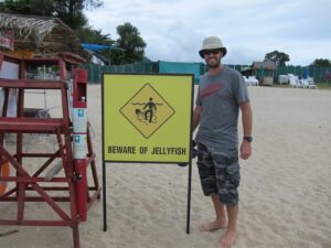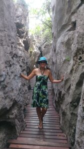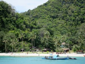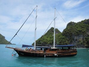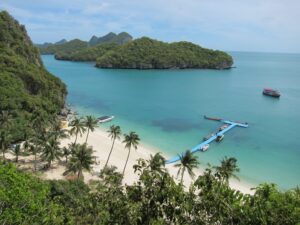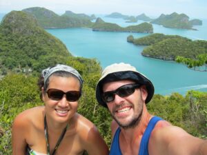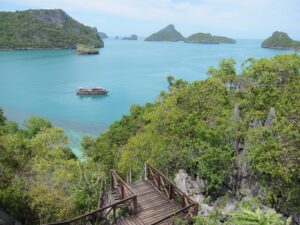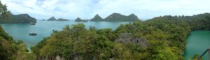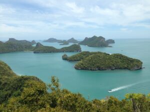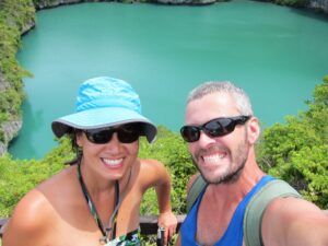 18 Sep – After an instant noodle breakfast, we made our way to the hotel reception for our 7:30 am pickup. Today we were visiting Angthong National Marine Park with Highway Travel High Seas. We were the last 2 passengers to be picked up from Lamai and we zipped over to the Nathon Pier to board our boat. Once onboard, we were offered a light breakfast and given life jackets. Becky was feeling off today so she laid down for the journey out to our first stop of the day, Ko Wau Talap Island. We were given about an hour to explore here, so we decided to climb up to the 262 meter high lookout point. The trail has been improved most of the way up, but for the last 150 meters we had to climb across extremely jagged rocks. Luckily there was a rope to grip and pull us up along the rocks but it is no easy feat. We can see why other travelers warned us not to wear flip-flops! The jagged rocks are no joke and can shred your feet in seconds. However, the hike was well worth it because the panoramic views alone were mesmerizing! We could see several neighboring islands surrounded by pristine turquoise waters…just beautiful. Thankfully we had hustled to be one of the first visitors to reach the summit, because the platform soon became overcrowded. We hiked back down and had a few minutes to enjoy a quick dip in the water to cool down before being herded back onto the boat for lunch. Lunch was a buffet, and Becky started feeling even more nauseous and queasy. Robby came back with two trays of food but the smell set Becky off. Anyone standing near the stairwell closest to the bathroom got to witness Becky desperately trying to make her way to the bathroom. And she didn’t make it, ha ha. Instant noodles were spewed everywhere…eeeew! But at least she felt a hell of a lot better afterwards. Our next stop was Ko Mae Ko where approximately a third of our boat’s passengers got off to do a bit of sea kayaking near the entrance for the Talay Nai Blue Lagoon or Emerald Lake. We hadn’t paid extra for kayaking, so we had free time to explore the Emerald Lake for ourselves. That required a climb up a steep staircase to a lookout point. From that vantage point, we would not only see the surrounding Angthong marine park but also the blue lagoon…very cool! The lagoon definitely had more of a green hue than an blue one, so the name “emerald lake” makes more sense than “blue lagoon”. We hiked down to the lake to check it out. This salt lake is completely surrounded by limestone cliffs and is fed by underground channels that connect to the sea. Back on the beach, we had about 30 minutes to enjoy a dip. The first third of the passengers were done with their kayaking so they swapped out with a second group of passengers who had been patiently waiting their turn to kayak. We were soon given the signal to head back to the boat. There was one final stop to pickup the second group of folks who had just completed their sea kayaking and then we turned around to head back to Koh Samui. There were heavy clouds over the island when we got back but luckily we had a great day out without any rain. Dinner was at a shack near our hotel on the main ring road. Prices in touristy Lamai are surprisingly good…we had expected to pay a lot more for food and drinks while here.