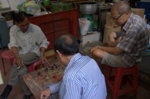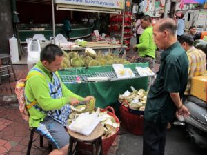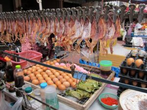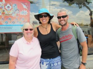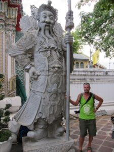 14 Sep – No major plans for today so we decided to sleep in till 10 am. Since we’ve been to Bangkok numerous times, we figured we’d hit some new places this go around. First destination was the Golden Mount where we were able to grab cheap bowls of duck noodle soup from the street vendors at the base of the mount. After checking off breakfast, we climbed the hill for a nice panoramic view over the city. Next up on our walking tour was the Giant Swing next to Wat Suthat Thep Wararam. Then we made our way to the Corrections Museum but it was closed for renovations so we made our way through the Sempang Lane Market. From there, we got lost in Chinatown’s old market area leading to the Chinatown Gate. After weeks of eating Vietnamese and Cambodian food, we were craving Chinese and this was the place to meet our needs! We found the most popular local joint, and had to wait to get a shared table. Several orders of braised duck, crispy roasted pork and grilled Chinese sausage hit the spot and we left Chinatown with big smiles on our faces. After a quick cool down in our room, we headed back out to the Museum of Siam but discovered it was closed for renovations. Consolation prize was to walk through the nearby vegetable and flower market, followed by a quick pit stop at the Pak Khlong Talat waterfront. Then we wandered by our old favorites of Wat Pho and the Royal Palace (no need to revisit since we’ve been multiple times). Unbelievably, the only 2 people we had run into today were Gill and Denise near the vegetable and flower market. Everyone in our group seemed content to do their own thing while in Bangkok and that suited us just fine. By this time, it was dusk so we figured it was food time. Maps.me indicated there was a local street food market just a few minutes away from our hotel but that looked completely dead so we walked over to another area that we had spotted on our walkabout earlier today. Roasted duck for dinner…yum! Yes, we might have a slight obsession with duck as it dawned on us that this was our 3rd meal with duck for the day!! The McDonalds near our hotel lured us in for ice-cream, and the 7-Eleven sucked us in for drinks. Robby bought what he thought was cheap beer. Imagine his surprise when the beverage turned out to be a sweet white wine! No thanks. Denise seemed to think it was OK so Robby happily donated it to her. Our original plans for the night were to hit Patpong for a ping-pong show but after reading dozens of reviews filled with horror stories about getting scammed out of money and how depressingly sad it was to watch the girls demean themselves, we decided to give it a miss. Instead, the night evolved into hanging out at a go-go bar in Patpong for Robby, Tig, Gill and Denise with Helen and Ant showing up later. The main strip of Patpong was a bit to tacky for everyone’s taste with pricey beer and a seedy atmosphere. So the gang relocated a few streets over to the Gay district which was a great idea because it was way more pleasant with better beer prices. Win-win! As luck would have it, we were across the street from a bar performing a drag show. Denise and Robby scored street level tables and were able to watch the entire show for free!