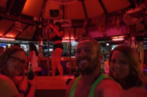 19 Sep – Today was a lazy day. After a sleep in, some noodles in the room and a phone call with Fran, we went down to the beach around 11 am. Our hotel’s beach front is close to the famous grandfather and grandmother rocks so we figured we had plenty of time to revisit them later. We really liked the Samui Beach Resort’s outdoor configuration…shaded beach loungers right next to a massage area and close to a bar and swimming pool, free WiFi and a nice view of the rock formations. Bliss. The ocean was colder than we had anticipated which made for a nice contrast with the hot sunny day. Lunch was at a restaurant just up the street from our hotel and afterwards, we decided to check out the nearby Makro supermarket, which looked like one of the biggest supermarkets on the island. Even though Makro usually requires a membership card to shop there, we were given a one time coupon for visitors. It was a good call to check this place out as we scored some really cheap brownies, ice cream, chocolate milk, yogurt drink and guava juice. Good thing our hotel room has a fridge! Back at the hotel, we had brownies and ice-cream…our new dessert was amazeballs. We quickly vowed to revisit Makro to pick up more brownies since they were buy one, get one free! In the evening, Becky still wasn’t at 100% so Robby hit the town with Tig and Gill to check out Swing Bar’s fire dance show. After the show they hit the night food market where they spotted one of the girlie bar dancers killing the competition. Of course they had to check her out up close while having a beer. They quickly found out that the dancer was the daughter of the very proud bar owner. Mom was super proud of her daughter working the pole, shaking what her momma gave her. The atmosphere at the bar was great since mom and daughter were super friendly and they provided board games (Connect Four and Jenga). The gang bar hopped to another bar down the street to shoot a few games of pool before calling it a night just after midnight.