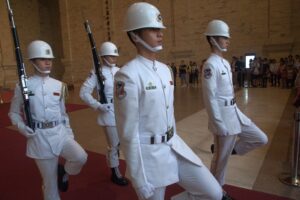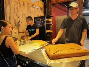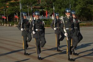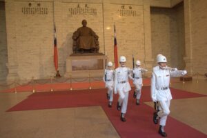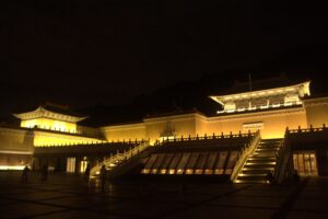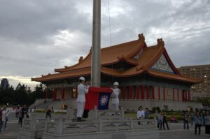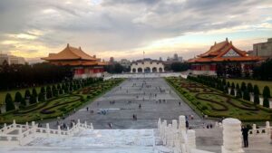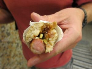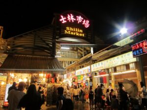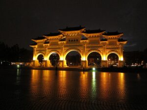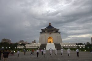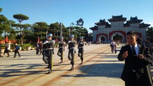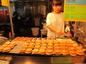 18 Nov – Back to Taipei. After checking out of the hotel, we grabbed 2 boba teas for the road and found the nearby Ho Hsin bus office where we bought return tickets to Taipei (NT$340). Traffic was good and we were back to the Taipei main station before we knew it. Making our way back to our hostel (Lucky One) was a breeze and the friendly receptionist remembered us from our first visit. She kindly upgraded us to a 2 bed dorm for free, which we appreciated. After dropping off our bags, we took the metro to visit Chiang Kai-shek Memorial Hall and Liberty Square. We arrived early enough to wander around until the 5 PM changing of the guard, which is the last one for the day. Instead of watching the soldiers getting relieved of their duty, we watched as they marched collectively down from their guard post to the center of Liberty Square where they conducted a flag lowering ceremony. It was dark when the ceremony was complete so we lingered around long enough for a couple of night shots before hopping on the metro to the Shilin night market. Even though it is very touristy, it is immensely popular with locals too and we found the place packed. For dinner we had a couple of savory pastries, big sausage wrap small sausage (Da Chang Bao Xiao Chang 大腸包小腸), boba tea, a massive pork sausage, and a generous serving of suncake (condensed malt suger cake). We were convinced to try it after spotting the ridiculous long line of locals patiently waiting on cake! Aaahhh, Taiwan – definitely a foodie’s paradise.