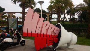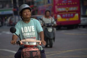 14 Nov – Happy birthday to Robby! Lucky guy also has a super moon to check out on his birthday…it will be the biggest one we’ll see in decades! After a bit of a sleep in, we checked out of Lucky One Hostel and took the metro to the Taipei city hall bus station where we bought a bus/train combo ticket to Hualien for NT$209. The bus to Lou Dong was comfortable but traffic was a mess so it took an extra hour to get to the train station. In Lou Dong, we wanted to catch the first train to Hualien, so we agreed to pay an extra NT$26 to upgrade (we could have waited another 2 hours for the slow local train but the extra 80 cent upgrade was worth it). When we arrived in Hualien we walked to Holo Hostel Hotel and checked in. Even though we had booked a double room (NT$1620 for 2 nights), we were given a spacious quad room for the two of us. Friendly helpful staff at the Holo hostel! We asked for a scooter recommendation and were pointed down the street towards the train station. A few minutes later, we were negotiating with the friendly staff at TTA Rental Company (03-8465558). They didn’t speak English so Becky negotiated the entire transaction in Chinese which left Robby in amazement since he’s never heard her string together more than a few phrases at a time. We scored a 2 day rental for NT$350 since it was already almost 3 pm by the time we got the bike and the office would close tomorrow at 5:30 pm. Best thing was we didn’t need a Taiwanese scooter license. Robby just handed them his US drivers license and good to go. We hopped on the bike and started driving towards Taroko Gorge when a helpful local lady asked us at the traffic light where we were headed. Since she was headed home and lived near Taroko Gorge, she told us to follow her as she took us on some back roads before we swung out onto the main “highway”. She was pretty excited that we were visiting Taiwan and was keen to show us some highlights along the way, stopping to explain in detail. It was very sweet of her to act as a spontaneous tour guide. When we reached her house, she pointed it out and told us to stop by anytime if we needed anything at all…she was willing to help us out. What a gem! We have run into numerous Taiwanese who go out of their way to be helpful and friendly; this country is amazing! Our new friend was worried we wouldn’t be able to find our way to the gorge and offered to take us there but we reassured her that with GPS, we were all set. After taking a selfie and finding her on Facebook, we were on our way again. Taroko gorge, even in the late afternoon, is mesmerizing. The further we drove in, the better the views got. After zipping our way around the gorge, we realized how lucky we were to have our own wheels – the busloads of tourists were on a strict schedule and had to hurry from sight to sight while we were able to take as much time as we wanted at each location. One of the off-putting things about visiting Taroko were all the warning signs about falling rock. Apparently several tourists have been killed and countless injured due to sudden landslides and falling rocks. There were signs everywhere advising that a helmet be worn at all times, so we got in the habit of hopping off our scooter, flipping the visor back and snapping photos with helmet attached. By 5:15 pm, it was getting dark so we decided to turn back into town. Driving in Taiwan is easy compared to Vietnam with the exception of making left hand turns and right turns on red are not allowed. It took us a while to master the 90 degree left turn – first you pull over to the far right lane, wait for the light to be green, drive straight into a “waiting zone” area in front of waiting traffic that is coming from the road on the right of the intersection. The traffic light will be red, so you have to wait until the light changes before you can drive straight across the intersection. Essentially, if you want to make a left turn at a red light, you have to wait through two red lights to complete the maneuver. If it sounds complicated, it was a bit tricky at first. Blue sign below indicates how it should be done.