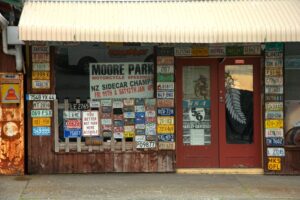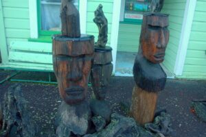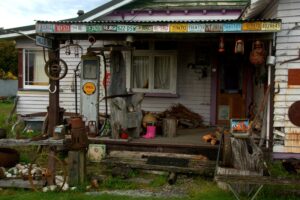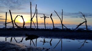 The iconic Hokitika driftwood sign at sunset