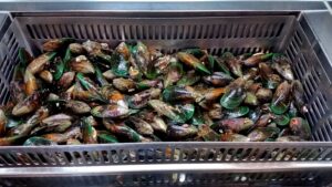 Fresh live New Zealand greenshell mussels, priced at a bargain $3 per kg