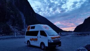 At sunset, we are one of a few cars remaining in the parking lot; Fox Glacier