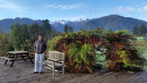 Becky at Lake Matheson's walkway entrance