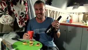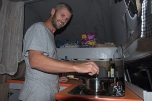 Robby preparing dinner in our camper van