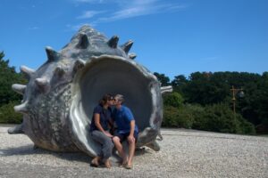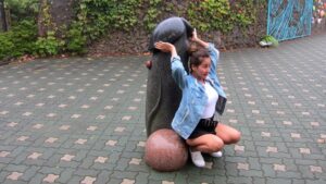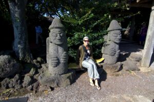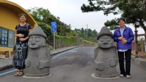 Becky and Chi Xuan pose next to guardian stone statues, protectors of Jeju Island; Yongduam