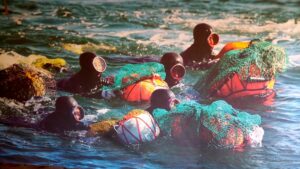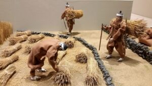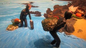 Photograph of "haenyeo", female divers from Jeju famous for gathering shellfish, abalone and sea urchins; Seongeup Folk Village