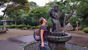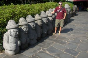 Robby and the "Dol Hareubang" (large rock statues) of Cheonjiyeon Waterfall