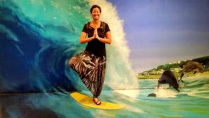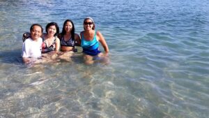 Becky enjoys a dip with her new friends Thai, Ying and Hai; Jungmun Beach