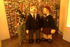 Posing with bears in traditional wedding outfits; Joanne Bear Museum