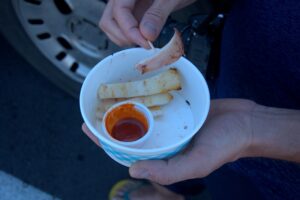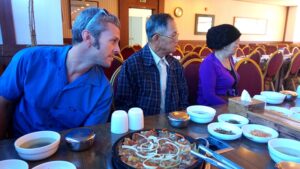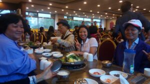 Enjoying our chicken dinner at a restaurant in Doduhang