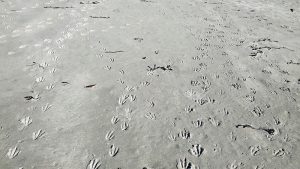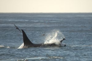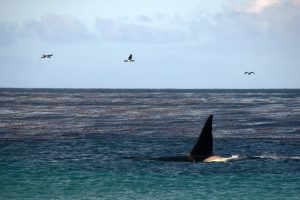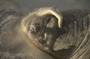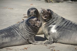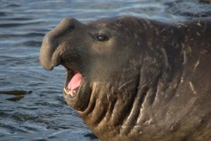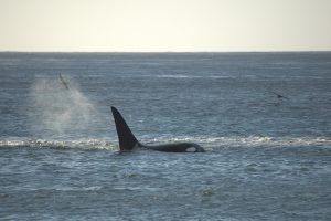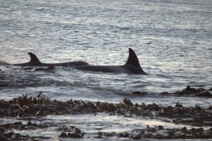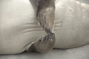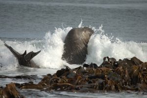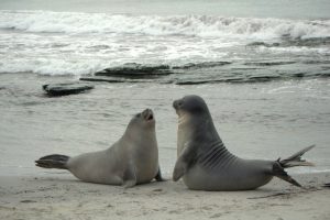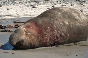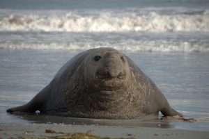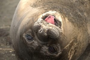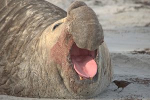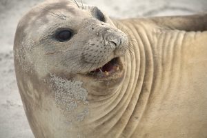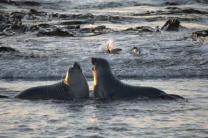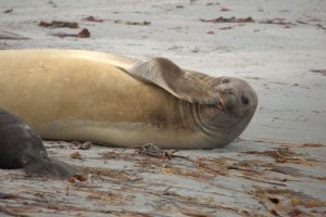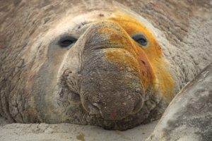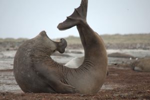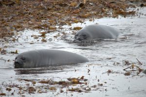 13 Nov: Alarm at 4:30 am and out the door shortly thereafter to watch sunrise over the beach. The orcas were out and about early this morning, circling around the pool where elephant seal pups were playing and swimming. We noticed that a couple of seals hadn’t gotten the word that the orcas were hunting and they were still blissfully unaware, swimming mere feet away from the orcas. One of them was about to have a life changing experience when the orcas finally decided to play “catch and release” with the seal. They would grasp the seal in their mouth and then release it, only to catch it again. Almost like they were teaching the young orcas how to hunt. There were several pods of orcas…Mickey had mentioned a pod of 2 (mother and calf), and a pod of 6 males (who would wait for the females to do all the work and then swoop in to enjoy the fruits of their labor). We saw nearly a dozen orcas cruising around. Most were a bit too far off to photograph, but one male orca had a massive dorsal fin that stuck out nearly 2 meters, resembling a sail. He was instantly recognizable even from a distance, and appeared to be the most senior and biggest orca in the water. We hung out from 5 to 7:45 and then called it quits to have breakfast and discuss our sightings. For lunch we asked for a to go lunch sack of ham and cheese sandwiches. Our morning adventure was to wander the other beach and check out the marine life there. More of the same on the bigger, main elephant seal beach so we got a bit bored and decided to walk around the pond. Quite a few juvenile elephant seals lounging around so we decided to take some photos. One especially inquisitive elephant seal came right up to Becky and sniffed her boots and hopped up onto her leg before deciding she would not make a good snuggle buddy! Very cute behavior but most of the pups have been tagged by the scientists and are now leery of humans. Robby went back to the lodge to grab our sack lunches and we enjoyed our meal while watching the elephant seals. Since they were all snoozing in the sun, we decided to follow suit and had a nice 60 minute siesta with the elephant seals. Bliss! After waking up, we walked back down the main beach and were dismayed to see how lazy the elephant seals had gotten because of the sun today. They hardly budged from one spot, and even the normally super aggressive bulls were struggling to open their bloodshot eyes to determine if we were a threat or not every time we ventured near. Since there wasn’t much action, we decided to take a break back at the lodge until 5 pm. The two hours before dinner weren’t very busy either, and we were glad we woke up early since the elephant seals were most active from 5 – 7 am. For dinner, we were joined by 2 new British guests (Bob and Barbara) who had arrived separately. The Falklands is deservedly popular with the British and we were the only Americans amongst the rest of the guests who hailed from the UK and Australia. Starter for dinner was ceviche with cheese, followed by a massive cut of beef and rissoto, topped with a fruit platter for dessert. Way too much food and we left stuffed. Early to bed tonight since tomorrow will be another early day. Our plan is to hike to the rockhopper colony on the other side of the island.