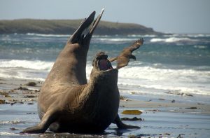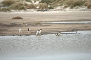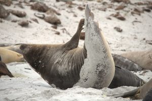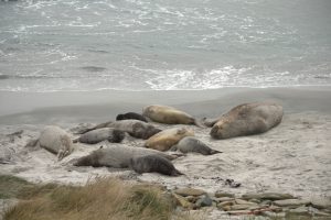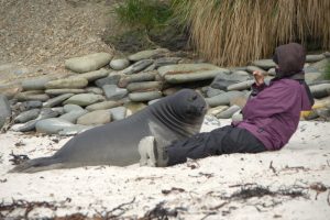 15 Nov: Up at 4:30 am and straight down to the beach. The wind was quite strong, and we were debating whether or not we had made a wise choice getting up early today. A scientist was already on the beach observing the elephant seals. The wind caused choppy waters and not a single orca fin was in sight. Boo! We sat down behind one of the rock shelters for protection against the wind but to no avail, it was coming from the only uncovered side. After 15 minutes of zero activity, we decided to retreat back to our down comforter bed, meeting an optimistic Bob on his way out to the beach. Slept until breakfast and heard Bob’s account that the bull elephants were a bit active after we left, protecting their harem’s and territory. Said goodbye to Jude and Andrew who were on their way to Volunteer Point for a 2 night stay with Derek and Trudi. Set out for a 3 hour excursion on the beach observing the elephant seals’ behavior. Just fascinating to watch the exhausted bull elephants force themselves to expend the energy to protect their harem. No wonder they lose up to 40% of their weight over this 2 to 3 month period! Based on their bloody battle scars, it is easy to see why many of them do not return next year as the orcas have a good chance of making a tasty meal out of their exhausted and depleted bodies. The wind alternated between bitterly cold and surprisingly warm. We were back by noon for lunch in the room, followed by a siesta. Good thing too as it rained while we were napping. Up at 3 pm for cake and tea, followed by another 3 hours outside. Saw the lone king penguin in the gentoo colony, and spotted orcas cruising off the other side of the beach (calmer there due to the persistent wind today). Saw two young orcas surfing the waves, but by the time we ran down to the beach, they had cruised way on down to the other end…they were swimming fast and even had one of the scientists sprinting down the beach just to keep up with them! Watched a couple bull elephants protecting their harems, and saw the younger bull elephant seals trying their luck. They must keep trying and trying as they know the dominant bulls are getting exhausted with their efforts at keeping their harem protected. Loved hearing the bull elephant seals roaring like a lion. Tried to take video of it but not sure if we captured the sound because of the strong winds blowing. Made it back to the lodge with minutes to spare for dinner, which we enjoyed with the remaining guests at the lodge over talk about life in Stanley and travel around South America. Found out that our flight tomorrow is scheduled for 9:15 am…it currently looks like we’ll be catching the first one out of here in the morning. Not sure if Lookout Lodge will let us check in so early but we’ll see! Settled the bill with Micky (4 nights all inclusive for 1360 pounds).