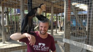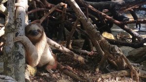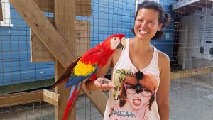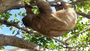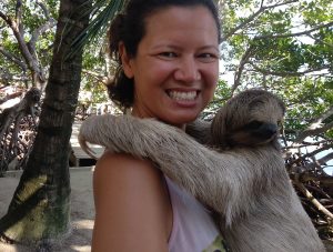 22 Jan: Woke up to yet more rain. Not looking good for our shipwreck dive at 9 am. After breakfast, we walked over to the dive shop and sure enough, they cancelled the wreck dive and had us slotted to dive over on the south side. We had already done all of our dives over there so we weren’t keen on yet another dive on that side of the island. After discussing it, we opted to look at renting a scooter instead, and riding around the island tomorrow. Today would just be a snorkel day? The staff recommended we check out Roacars for the cheapest rentals (part of the green hospital building that we saw near the intersection). Sure enough, daily rentals were $25 and the staff was friendly and helpful. We told them we’d be back tomorrow and returned to the dive shop to let them know we definitely were out for diving today and tomorrow. Barbara (co-owner of the dive shop) settled our bill with us and we paid a combination of cash and Lempira. Total damage was $272 for 3 dives each ($45 per dive to include a marine park fee and transfer fee to the south side). If we had done the 4th dive, we would have gotten a better rate ($35 per dive). Barb told us that if we returned to dive again, repeat customers would get each dive for only $30 so that was good to know. We grabbed our snorkel gear and went to Half Moon Bay to check out the marine life there. Not too shabby…we spotted a stone fish, eel, lionfish, 4 squid in formation, and lots of small fish. The sun appeared near the end of our snorkel. It was turning out to be a magnificent day! We took a quick shower and grabbed a lunch of peanut butter sandwiches before heading back over to the rental agency. We decided to ask Roacars if they would let us rent a scooter for 24 hours for $25 and they readily agreed. It was 1 pm when we drove out towards French Cay, home to Daniel Johnson’s Monkey and Sloth Hang Out. The island is deceptively bigger than we anticipated, and it was nearly 2 pm when we finally reached the sanctuary. Luckily for us, the large tour groups were gone, so we had a tour guide all to ourselves. He was a young, personable guy but got viciously attacked by a raccoon while he was trying to give it some water. It bit him on the leg and drew blood. We were shocked, because he was quite blasé about even though it was obvious he was in pain. The white faced capuchin monkey pen was hilarious, with monkeys flying from one corner of the cage to another, bouncing on top of our heads and using their tail as an extra appendage. Their feet and hands were oh so soft, and they were quite comical until Snookie tried to nibble Robby on the cheek when our guide stopped giving her treats. Cheeky monkey and thankfully she didn’t draw blood! Our guide asked for a few minutes to bandage his wound, and we had free time to check out the sloths in a nearby tree. They were leisurely moving from one branch to another and one was taking a poop (slow motion of course). We got to hold one of them and it was magical as they clasped their arms around our necks and held on. Their claws are long and sharp but they were gentle and very calm. It was pretty awesome getting a sloth hug! The parrots and macaws were next and they were OK but the real highlight had been the sloths. Well worth the $10 entrance fee! After our visit, we decided to drive to the other end of the island, stopping to take photos along the way. We turned around in Punta Gorda and drove towards West Bay for sunset. It was a long drive but we made good time, arriving 10 minutes before sunset. To our surprise, West Bay was still packed with tourists. The resorts here must be packed! There was a large colorful wooden chair to sit on for photos so we took our obligatory pics before heading back to West End. Dinner was at the Creole’s Rotisserie Chicken shack next door to Georphi’s which was good but not great like everyone had raved about. It was pricey too with our meal coming out to $25 (half a chicken with 2 sides and dessert). Back to the room by 8 pm and it was an early night.