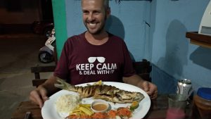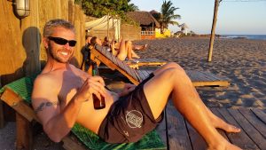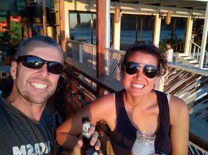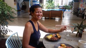 7 Feb: Last breakfast at Salina…we will sure miss this place! Back to the room to pack before checkout at 11 am. Robby had to go pick up his shorts which had been repaired overnight. After checkout, we lounged by the pool until 12:30 and our shuttle was on time to pick us up. It was a full van with 7 of us headed to San Juan, and 2 stragglers trying to get to Tree House. Apparently, the driver didn’t know how to get there and he eventually found his way there, but dinged up the vehicle in the process. Some of our fellow passengers were freaking out because they told him there was no way the van was going to make the journey and that the 2 guys should just walk there with all their gear. They weren’t having it and we did make it there in the end, but the van did take a lot of abuse in the process. Probably not worth the fare! In San Juan, we were the last ones dropped off at our hostel (Casa Romano) and we checked into our room (immaculate, very comfortable with AC which was a bonus). We quickly wandered around town for a happy hour/dinner quest and settled on #1 rated cheapie restaurant, Dale Pues, which served up cheap burgers and Nicalibres for $1. Afterwards, we ran into the Japanese and British backpackers that we had met back in Copan. They had reunited again and it was funny that we kept running into them in various countries. We found a beach restaurant that served up 2 for 1 pina coladas and settled in for sunset which was nice. Topped off our night with gelato ice-cream which was a nice treat.