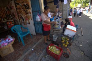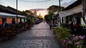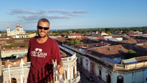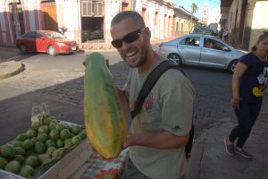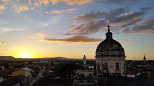 1 Feb: Got up for our free breakfast at 8 am. Very surprised to learn that they only served coffee here (no tea), but no matter. Breakfast itself was a fruit plate and traditional meal of beans and rice, eggs, and toast. A pretty hearty breakfast considering it is free! We hung out in room until lunch, and then went to the local market to grab tomatoes, onions, garlic, avocados, and peppers which came out to 98 Cordobas for everything…not bad! Made pork fajitas for lunch but the kitchen had zero spices which sucked as a bit of salt and pepper would have made a big difference. Back to room to chill in the AC for a few hours before heading back out for a bit of sightseeing. On our agenda today was a 4 pm walk to a church followed by a climb up the bell tower for sunset at Merced Church. We saw the French guy (Jeremie) again but Robby gave him the cold shoulder for some reason. Back at Selina and we had to partake in happy hour. We got 2 pina coladas and 2 beers for 220 Cordobas and while we were enjoying our drinks, ended up buying 2 hammocks from a 15 year old kid named Michael. Cute kid and good salesman, especially since he probably took advantage of our merry state! Went to eat pizza at the #1 rated spot on TripAdvisor and it was OK. Price was good (260 Cordoba for large pizza and 2 drinks, and we tipped the waiter 40 Cordoba which made him happy). Music blasting all night long…you can tell it is a Friday night here. Selena hotel is a party hotel!