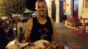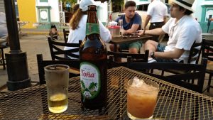 5 Feb: Slept in and had breakfast at 8:30 am. This morning was laundry day. We wandered around until we found a place to do our laundry (9 lbs which was 240 Cordobas), and then we walked over to the nearby Convent of San Francisco. It costs 140 Cordobas for entry, which grants access to 5 museums. We added this to our “to visit” list for tomorrow since it looked worthwhile. Off to the market to get some chips, salt, and avocados, and also to hunt for a seamstress to fix Robby’s shorts. Back at the room, we relaxed in the AC until 2 pm when we cooked up the rest of our pork for fajitas for lunch. It was 3 by the time lunch was over, perfect time to pick up our laundry. Everything was clean except our socks, 2 shirts and Becky’s hat so Robby went to see if they would honor their 100% satisfaction guarantee. The guy reluctantly agreed to rewash the items, and told him to come back at 11 am for pick up. Dinner was our nightly routine on La Calzada. This time we went back Isa House since they have the best cocktails/beer. There was a 20 wing special with 4 beers for 330 Cordoba, so we had chicken wings again for the 4th night in a row! The macua cocktails were delicious as usual and Becky downed 4 of them. We need to get out of this city or we will both gain 10 pounds!